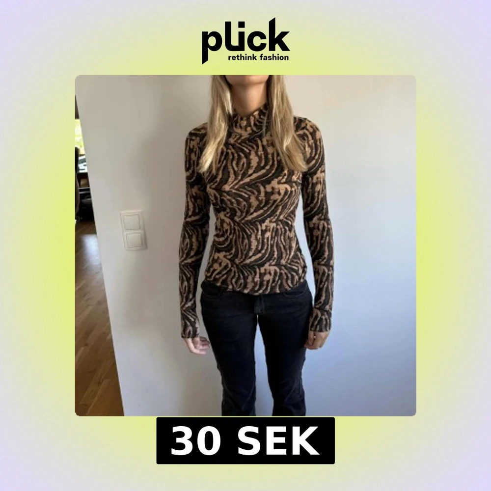 Säljer en tight zebramönstrad polotröja i brunt och svart. Tröjan har lång ärm, hög krage och sitter slimmat mot kroppen. Perfekt för dig som gillar att sticka ut med coola mönster och vill ha en trendig look.