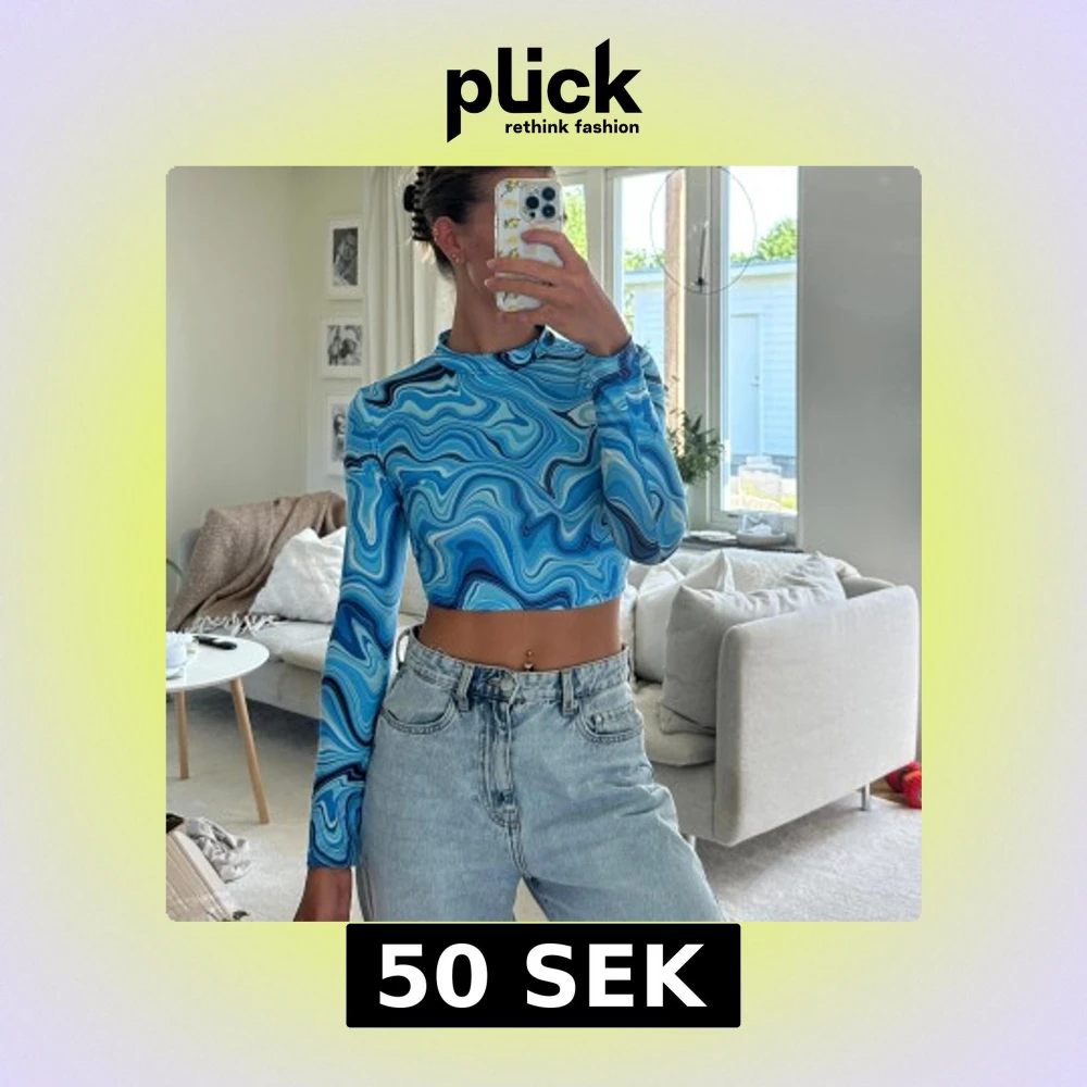 Säljer en croppad långärmad topp från Shein med blått vågmönster i olika nyanser. Toppen har en tight passform och är gjord i ett stretchigt syntetmaterial. Perfekt för dig som gillar färg och vill sticka ut lite extra.