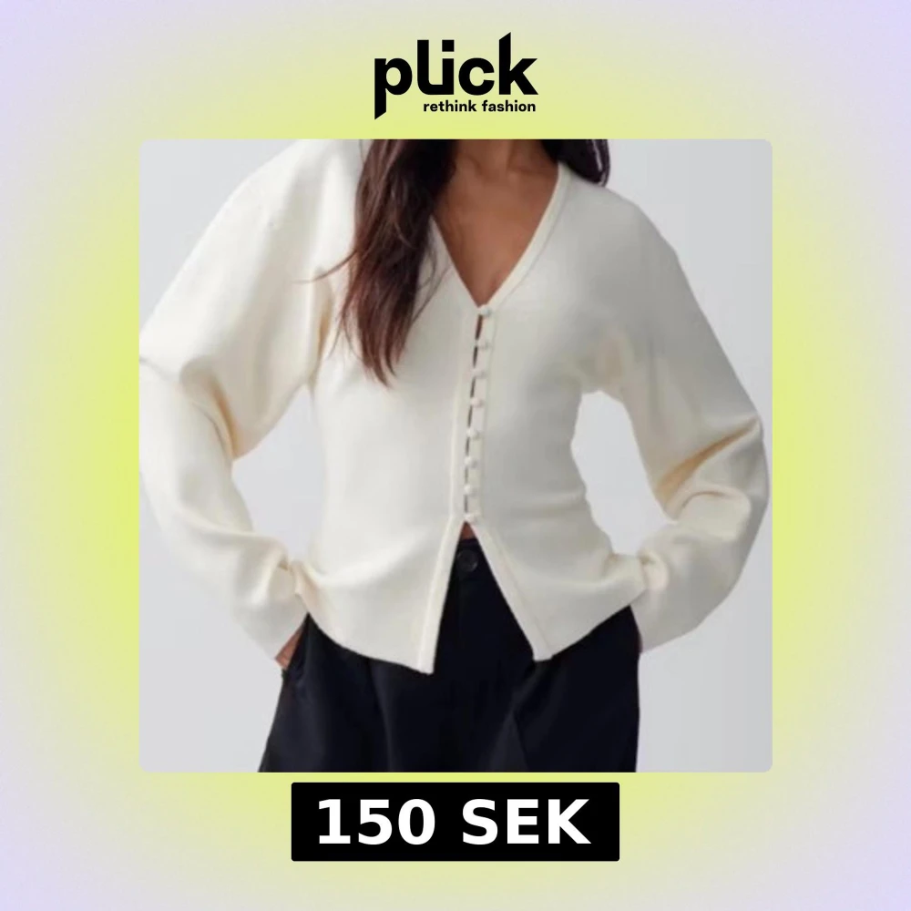 Säljer en stilren vit kofta med v-ringning och dekorativa knappar framtill. Perfekt för en elegant och avslappnad look. Passar bra till både jeans och kjol.
