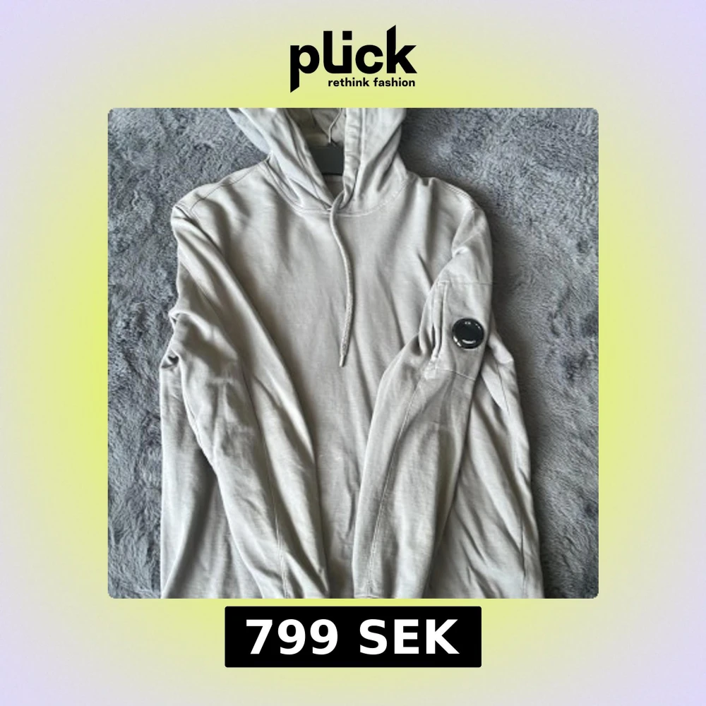 Säljer en stilren beige hoodie från C.P. Company med deras ikoniska linsdetalj på ärmen. Tröjan har huva med dragsko och långa ärmar. Perfekt för en avslappnad och trendig look.