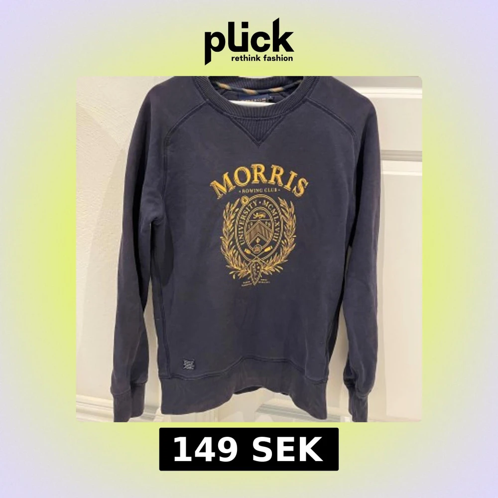 Säljer en mörkblå sweatshirt från Morris R. Club med guldfärgat tryck och emblem på bröstet. Tröjan har långa ärmar, rund halsringning och ribbade muddar vid ärmslut och nederkant.