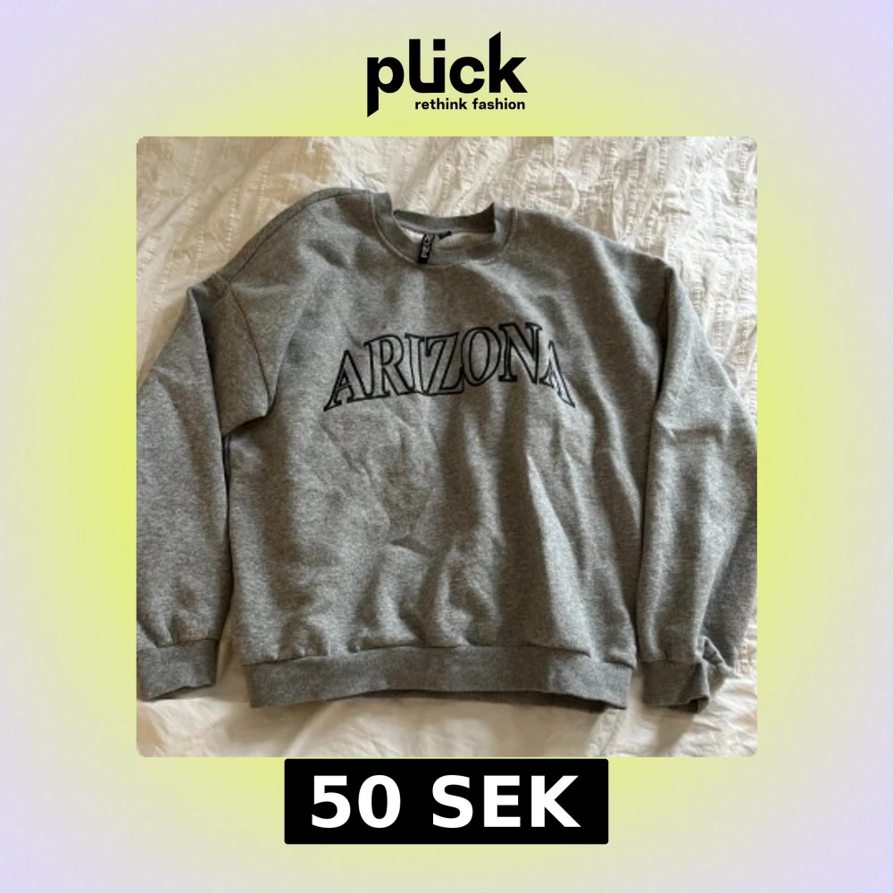 Säljer en grå sweatshirt från PIECES med svart text 'ARIZONA' på bröstet. Tröjan har rund halsringning, långa ärmar och ribbade muddar vid ärmslut och nederkant.