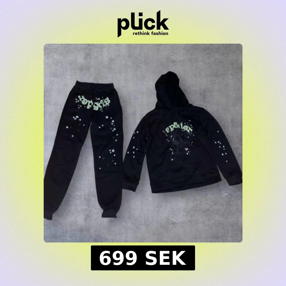 Svart hoodie med huva och snörning, dekorerad med stjärnor på ärmarna och ett grönt Sp5der tryck framtill. Materialet är mjukt och skönt, perfekt för chill dagar. Matchande svarta byxor med samma stjärnmönster ingår.