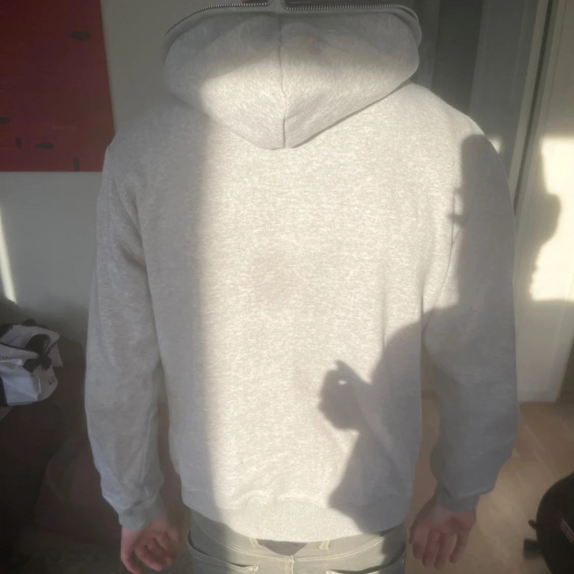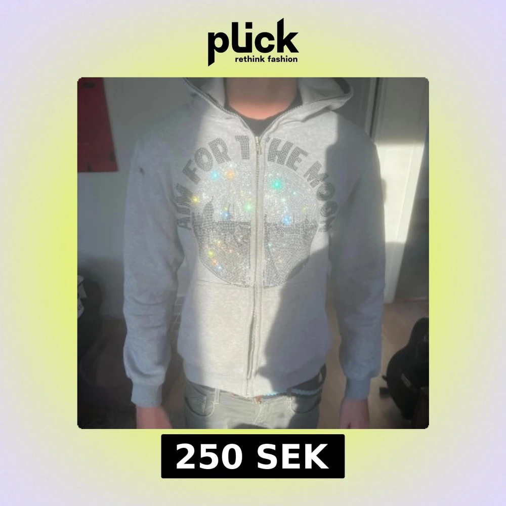 Snygg ljusgrå hoodie med dragkedja och huva. Framsidan har ett stort glittrigt tryck med texten 'AIM FOR THE MOON' och massor av små stenar som reflekterar ljuset. Perfekt för dig som vill sticka ut lite extra.