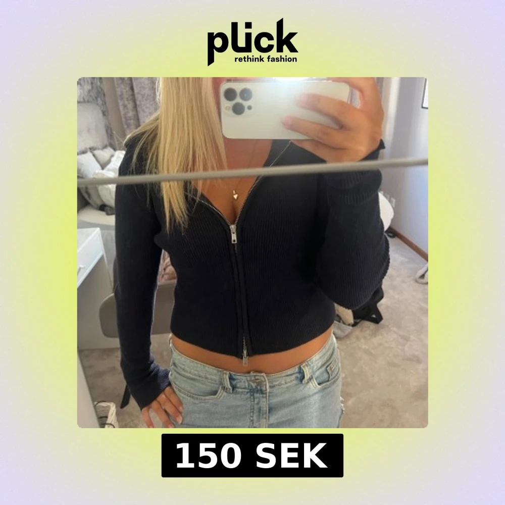 Snygg mörkblå ribbad huvtröja med croppad passform och lång ärm. Tröjan har en hel dragkedja framtill och är perfekt att styla med jeans eller kjol. Enkel och stilren design som passar till många olika looks.