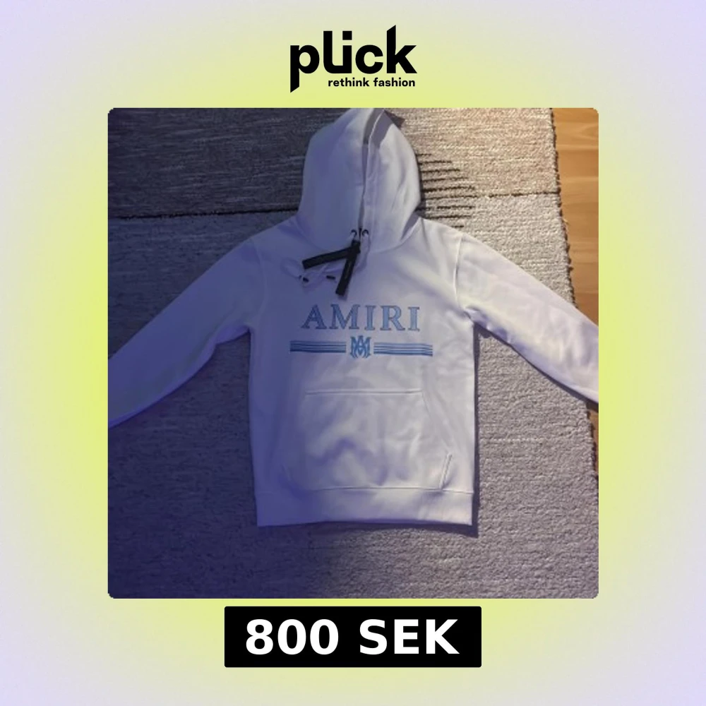 Säljer en vit hoodie från Amiri med blå logga och dekorativa linjer på bröstet. Tröjan har huva med dragsko och en stor magficka. Perfekt för dig som gillar streetwear och vill ha något stilrent men ändå iögonfallande.