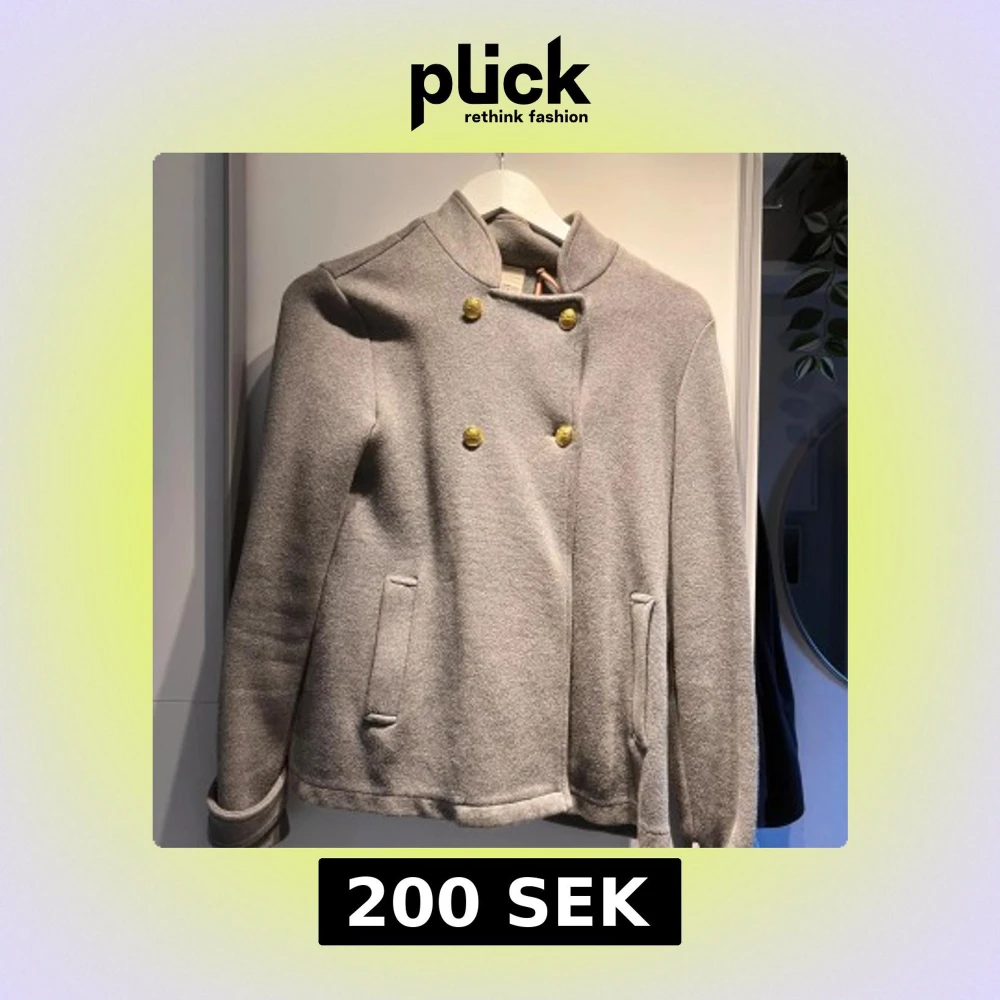 Snygg grå skepparkavaj med guldknappar från Holly & Whyte. Jackan har en stilren ståkrage, två fickor fram och är helfodrad. Materialet är mjukt och känns som ullmix. Perfekt för dig som gillar klassisk stil med en modern twist. Aldrig kommit till användning