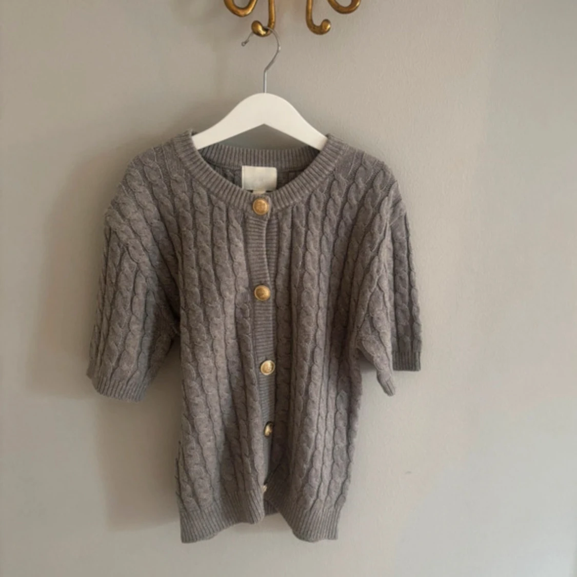 Grå kabelstickad kofta med korta ärmar och snygga guldfärgade knappar framtill. Rund halsringning och ribbade muddar ger en chill och trendig vibe. Perfekt att slänga över en t-shirt för extra stilpoäng.