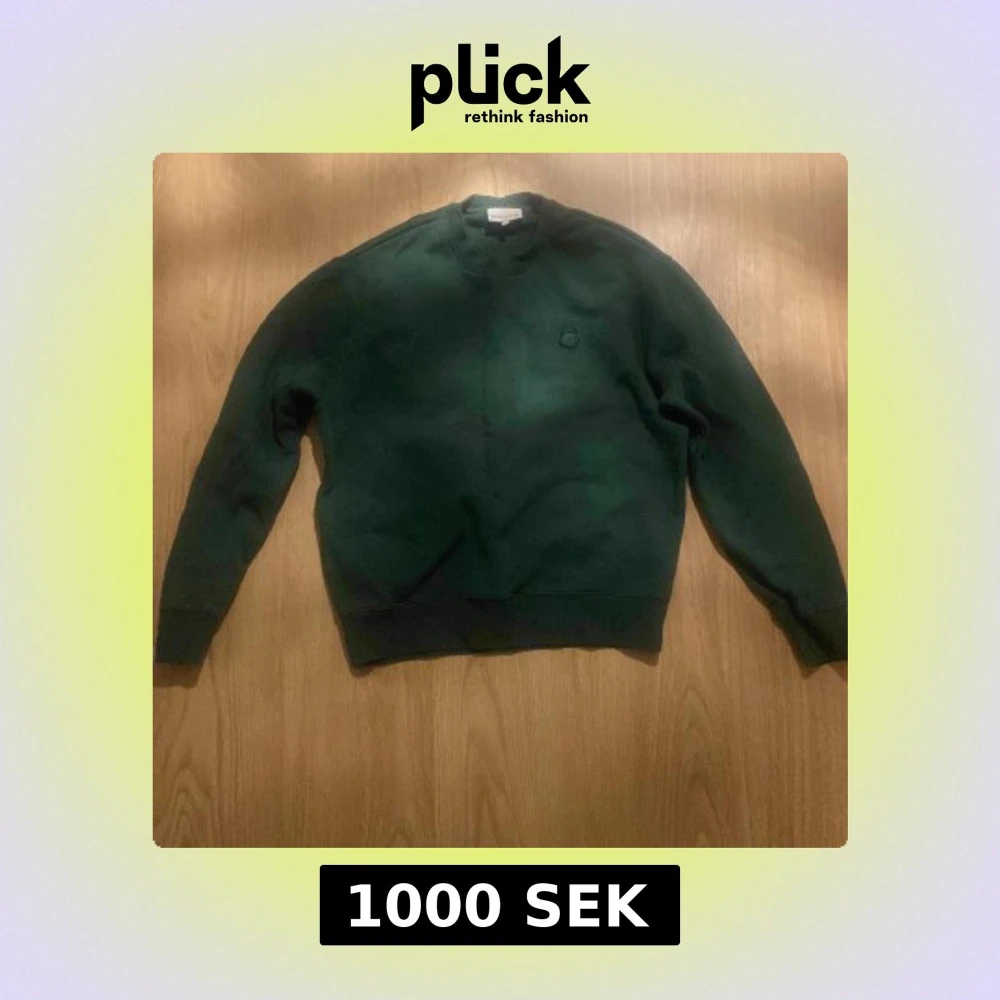 Säljer en stilren grön tröja från Maison Kitsuné med ett broderat emblem på bröstet. Tröjan har långa ärmar och en klassisk rund halsringning. Perfekt för en avslappnad look.