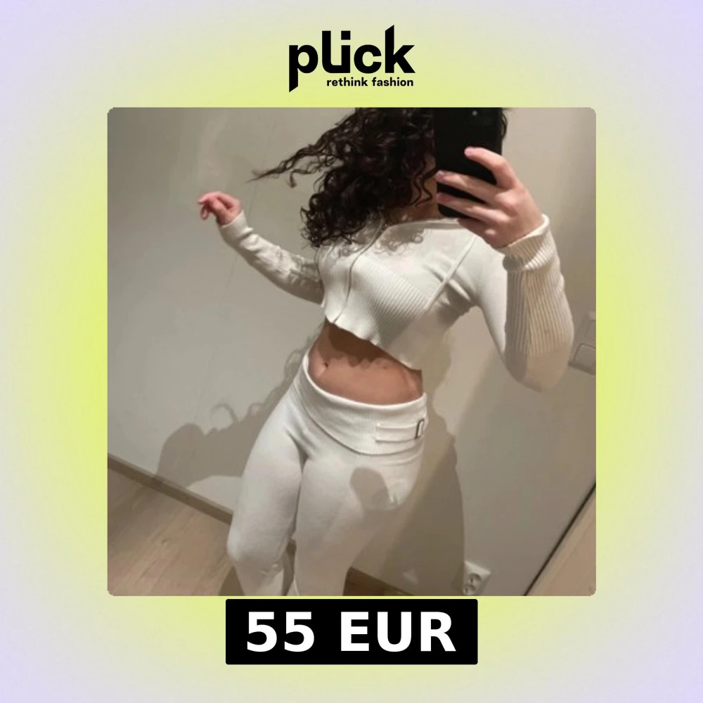 Säljer en snygg vit croppad hoodie med matchande byxor. Hoodien har dragkedja och långa ärmar, perfekt för en stilren look. Byxorna har en hög midja och är i ett mjukt material.