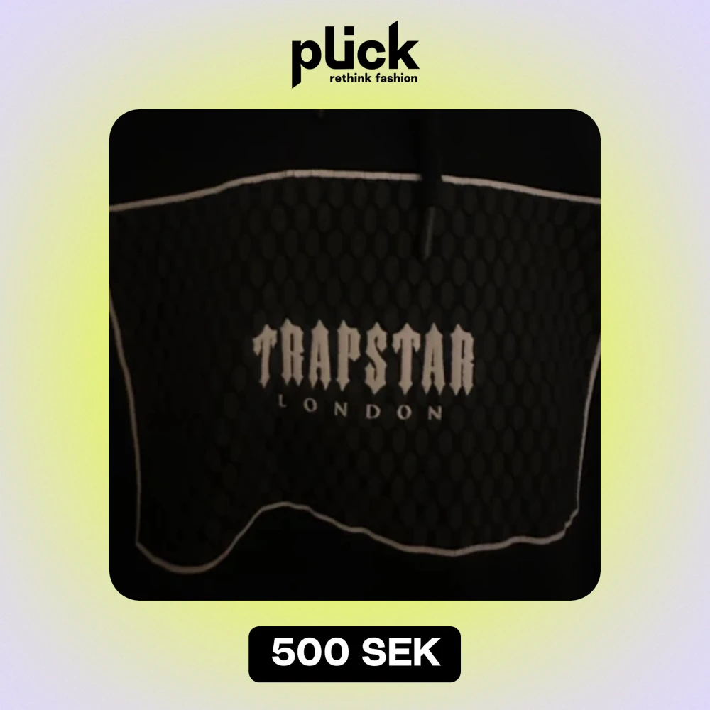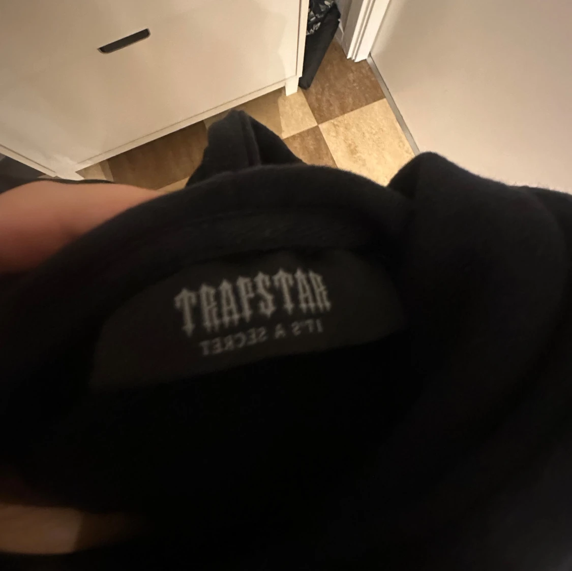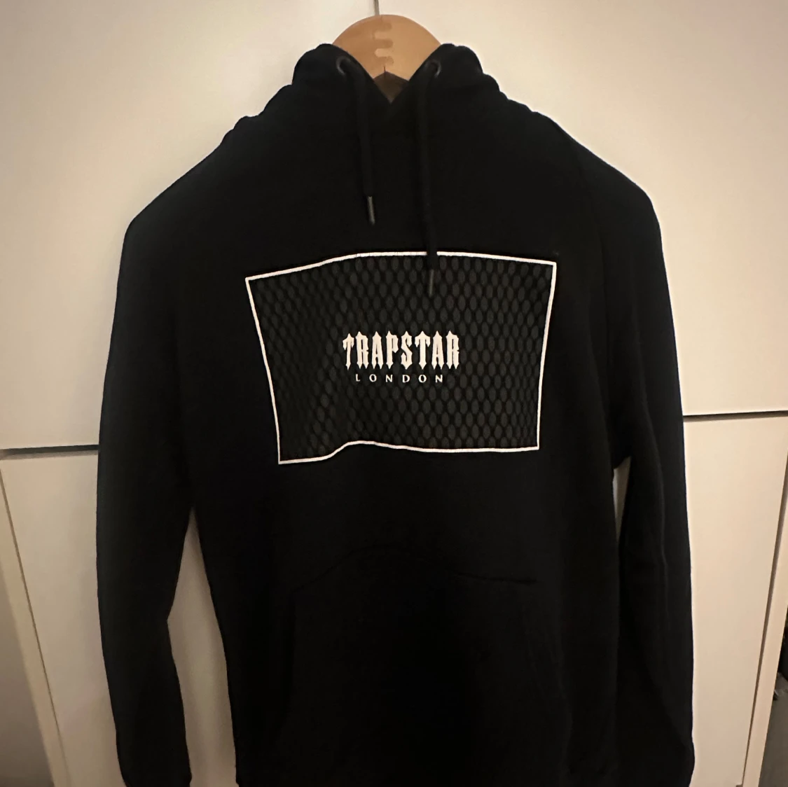 Säljer en svart hoodie från Trapstar London. Den har en cool design med ett mönstrat tryck på framsidan och texten 'Trapstar London'. Perfekt för en avslappnad och stilren look. Hoodien är använd 1 gång. Nypris är 150£.