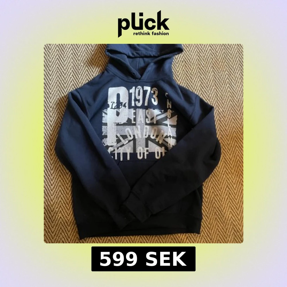 Snygg mörkblå hoodie med stort tryck på bröstet med texten '1973 East London City of Old' och motiv av Union Jack. Tröjan har huva, snörning och en klassisk . Perfekt för dig som gillar streetstyle och coola prints.