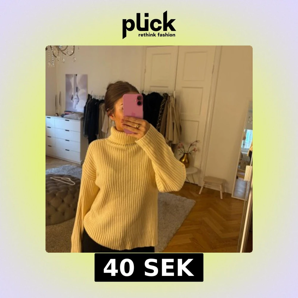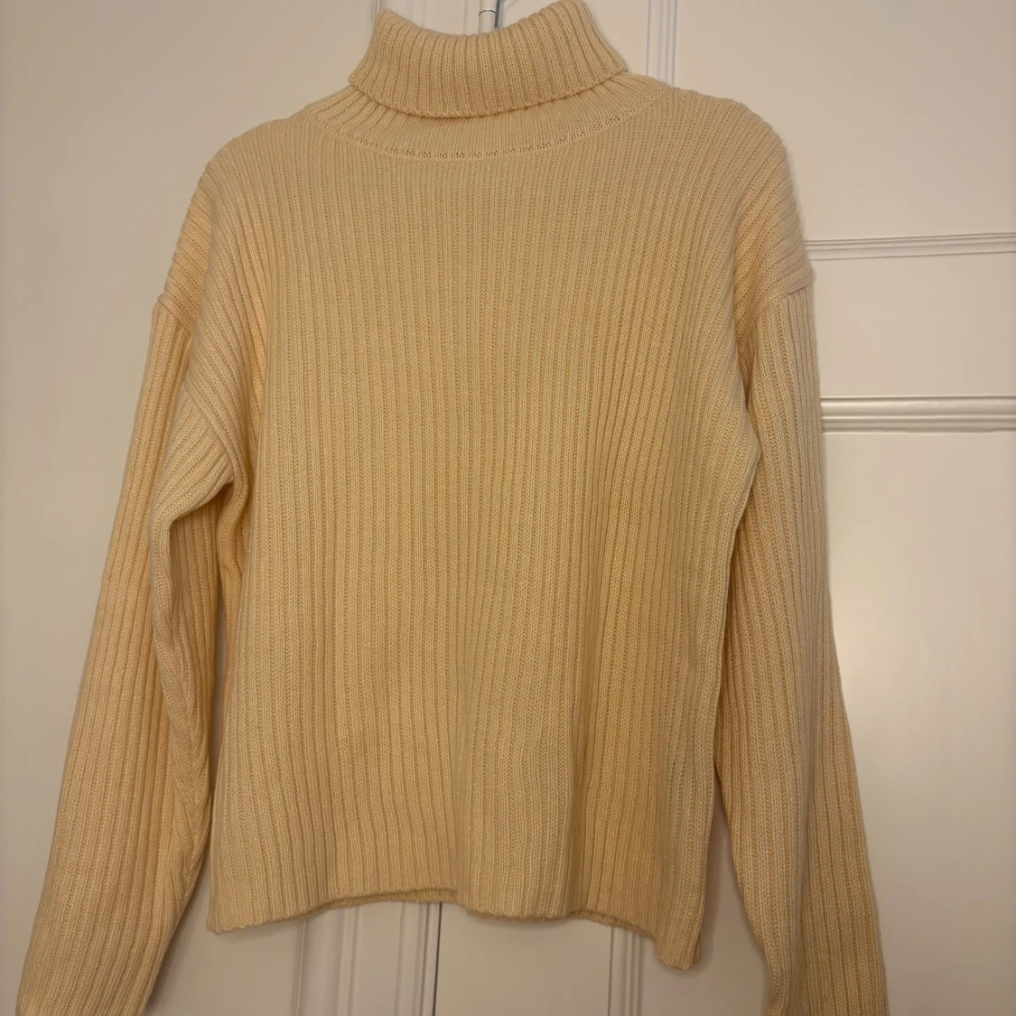 Säljer en beige/ljusgul ribbad polotröja med lång ärm och hög krage. Tröjan är stickad och har en loose fit med breda ärmar, perfekt för lager-på-lager. Enkel och stilren design som passar till det mesta.