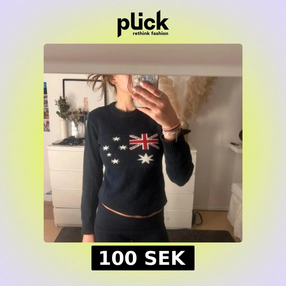 Mörkblå stickad tröja med rund hals och lång ärm. Framtill finns ett stort motiv av Australiens flagga i rött, vitt och blått. Tröjan är croppad och har ribbade muddar vid ärmslut och hals. Tröjan är ifrån Holebrook Sweden