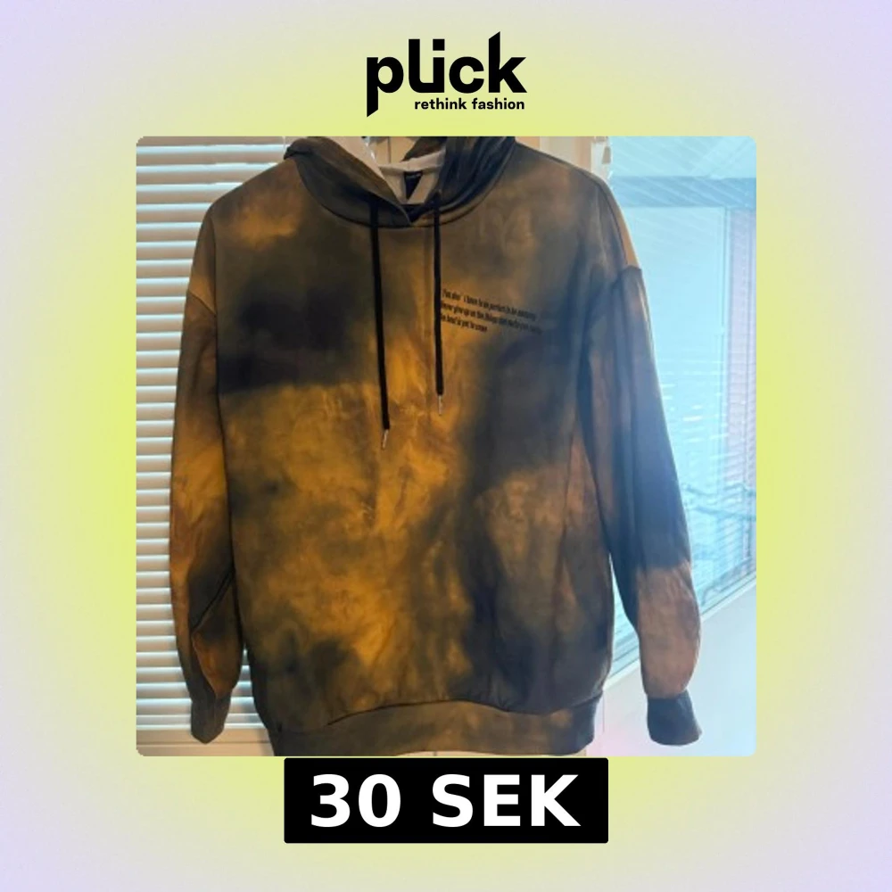 Hoodie från SHEIN i storlek S med tie-dye mönster i svart, grått och gult. Tröjan har huva med svarta snören och tryckt text på bröstet. Ganska tunn.
