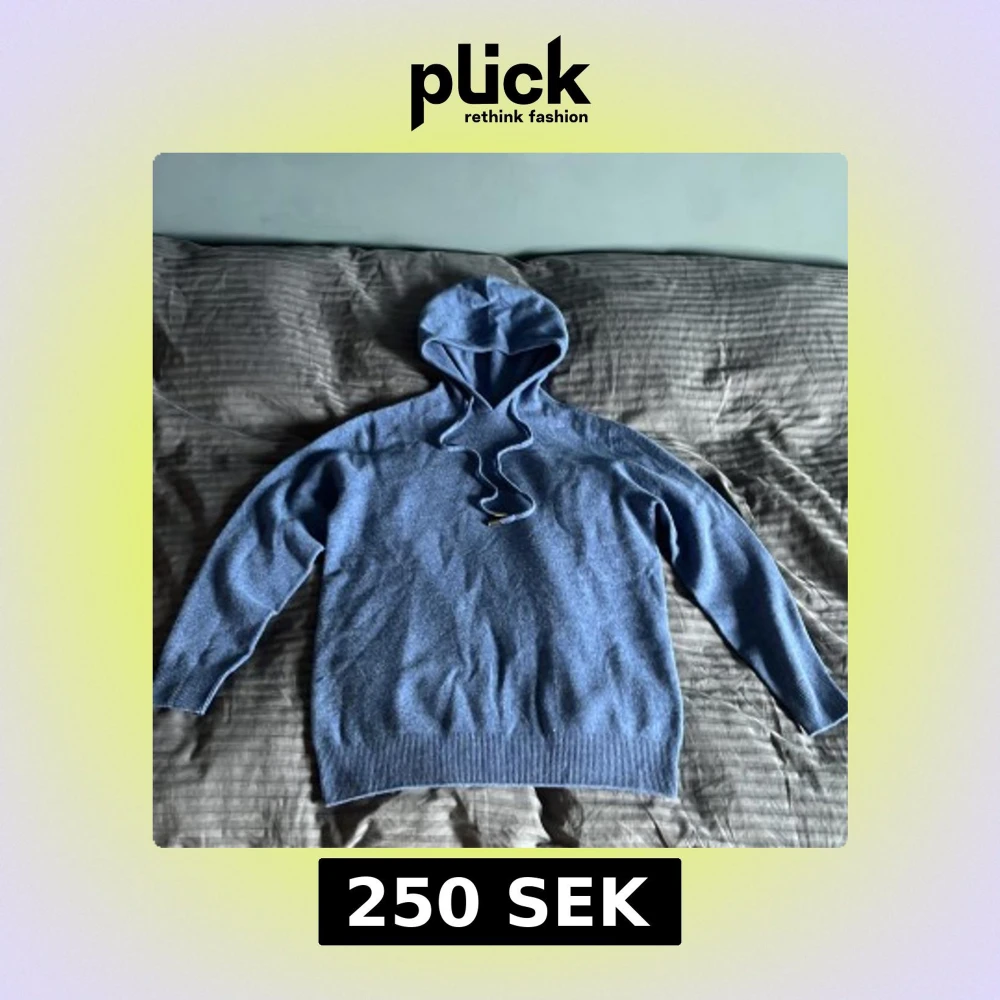Blå stickad hoodie med huva och snörning. Tröjan har långärmade ärmar och ribbade muddar vid ärmslut och nederkant. Perfekt för dig som gillar en chill och avslappnad stil. Materialet är mjukt och skönt mot huden. Tyvärr kan jag inte skicka bild på hur den sitter på mig för den är så liten för mig. Tror att någon som är 170-185 skulle passa för att den e töjbar