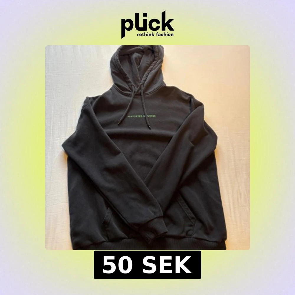 Svart hoodie med trycket 'Distorted Universe' framtill och en stor glitchad grafik på ryggen. Tröjan har huva med snörning och känguruficka. Perfekt för dig som gillar streetwear och unika prints.