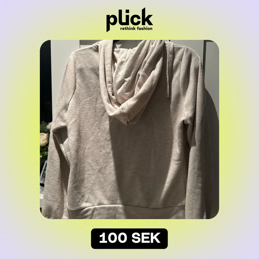 Mysig beige hoodie i mycket bra skick. Den har en praktisk dragkedja framtill och en stor huva med snören. Perfekt för kyliga dagar eller som ett extra lager under jackan. Den har också två fickor framtill för att värma händerna eller förvara småsaker.