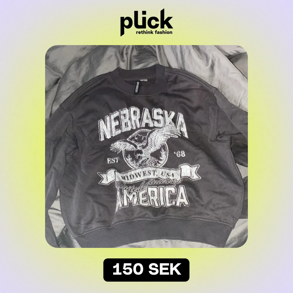 Säljer en grå sweatshirt från H&M Divided med tryck av en örn och texten 'Nebraska America'. Tröjan har en avslappnad passform och är perfekt för en casual look. Den är i bra skick och passar perfekt till jeans eller leggings.