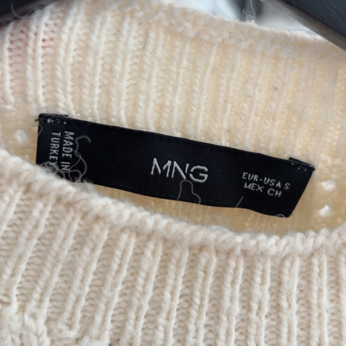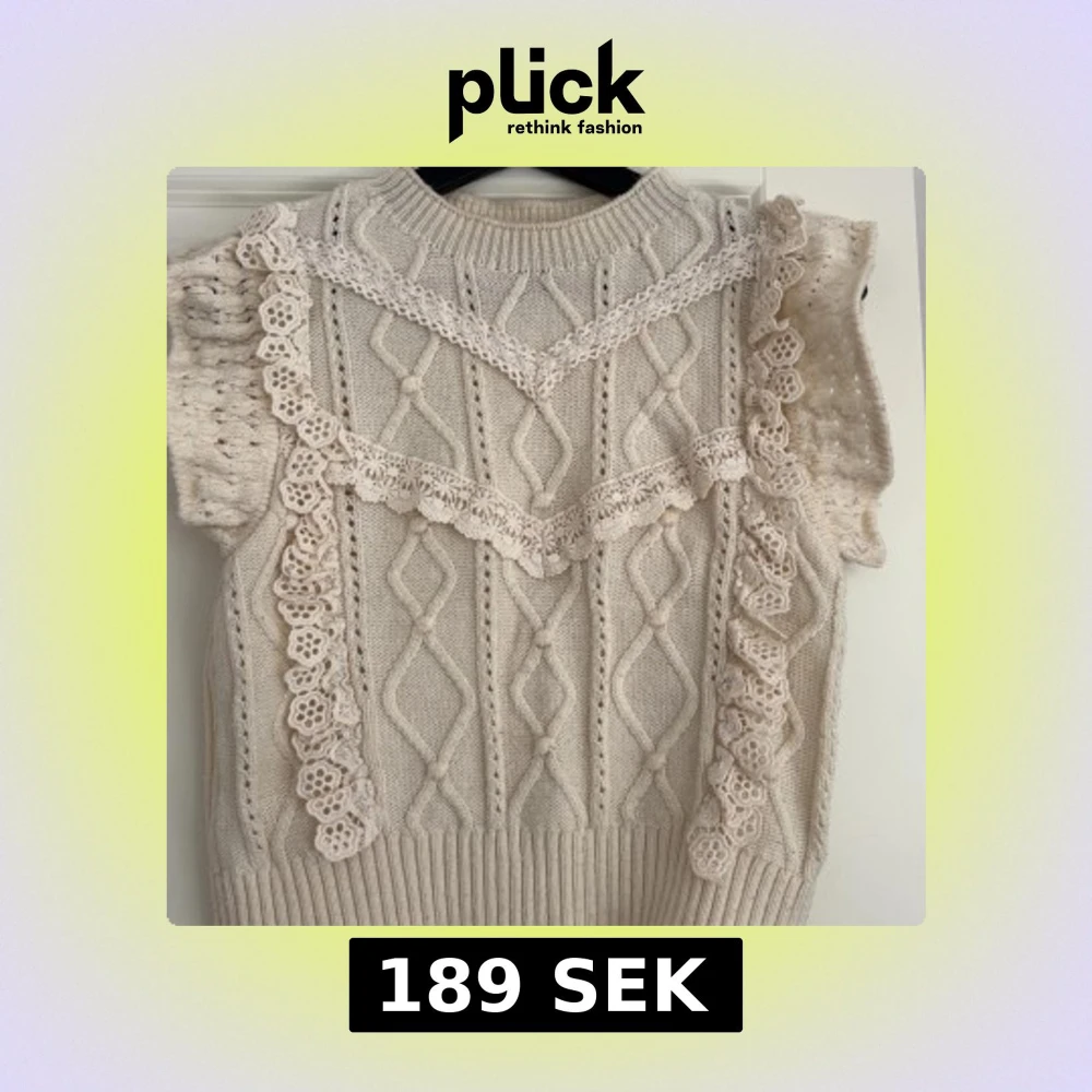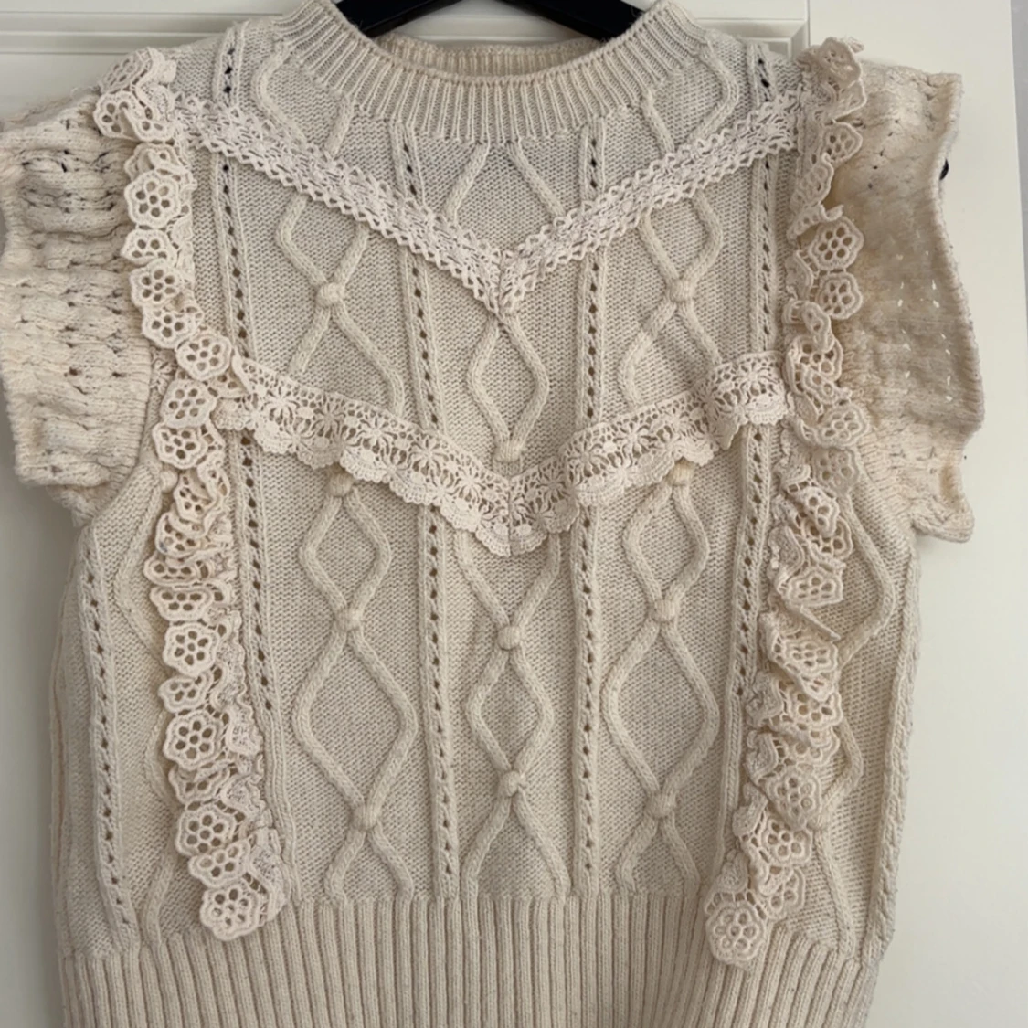 Supersöt stickad topp från MNG i ljusbeige med korta ärmar och dekorativa virkade spetsdetaljer. Snyggt kabelstickat mönster och ribbad nederkant. Perfekt för dig som gillar romantisk och unik stil.