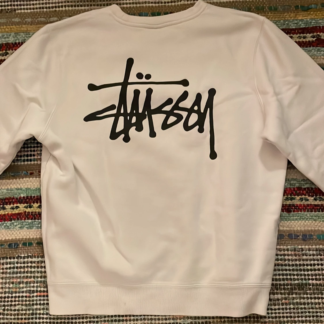 Vit crewneck sweatshirt från Stüssy med svart logga tryckt på bröstet och en stor logga på ryggen. Tröjan har rund hals.