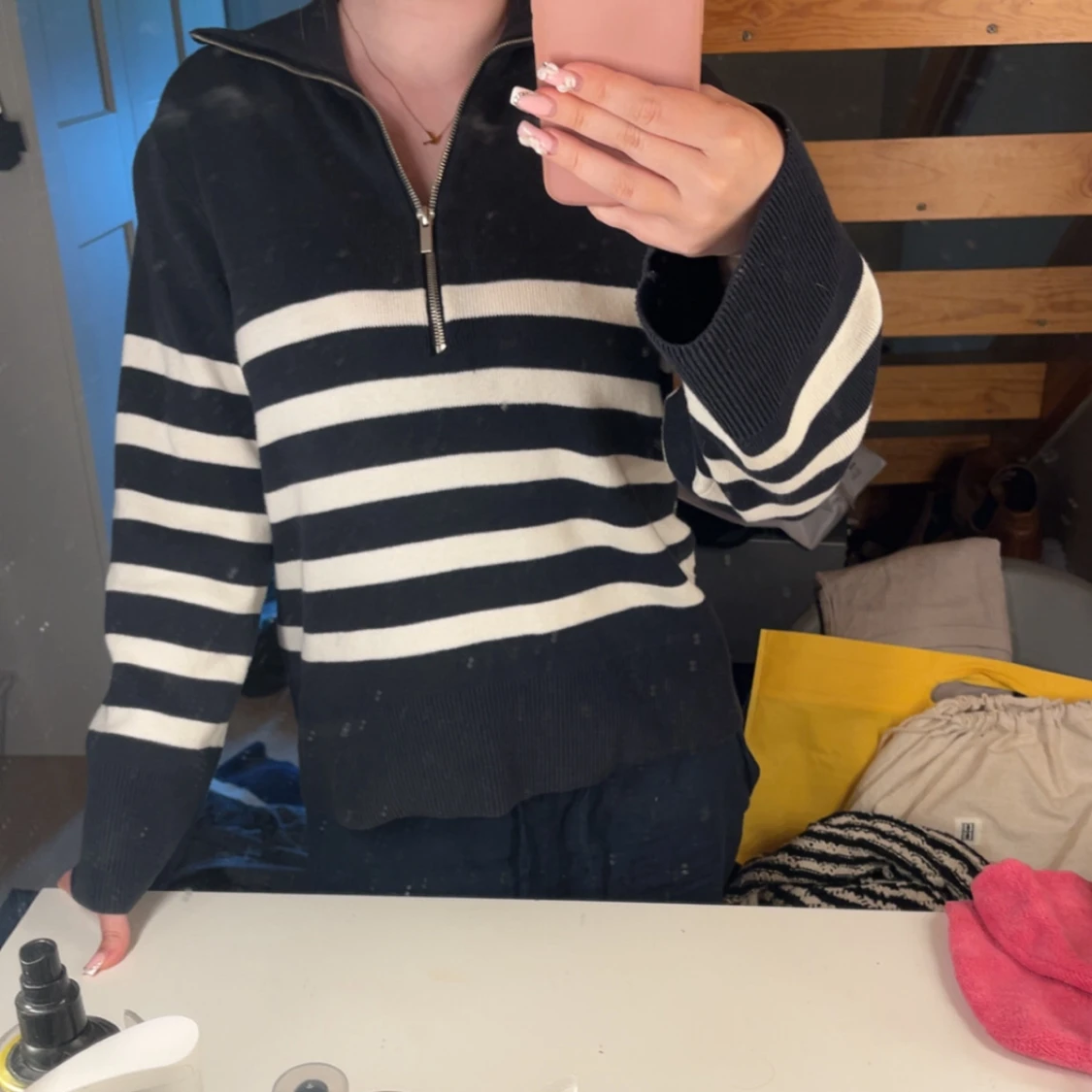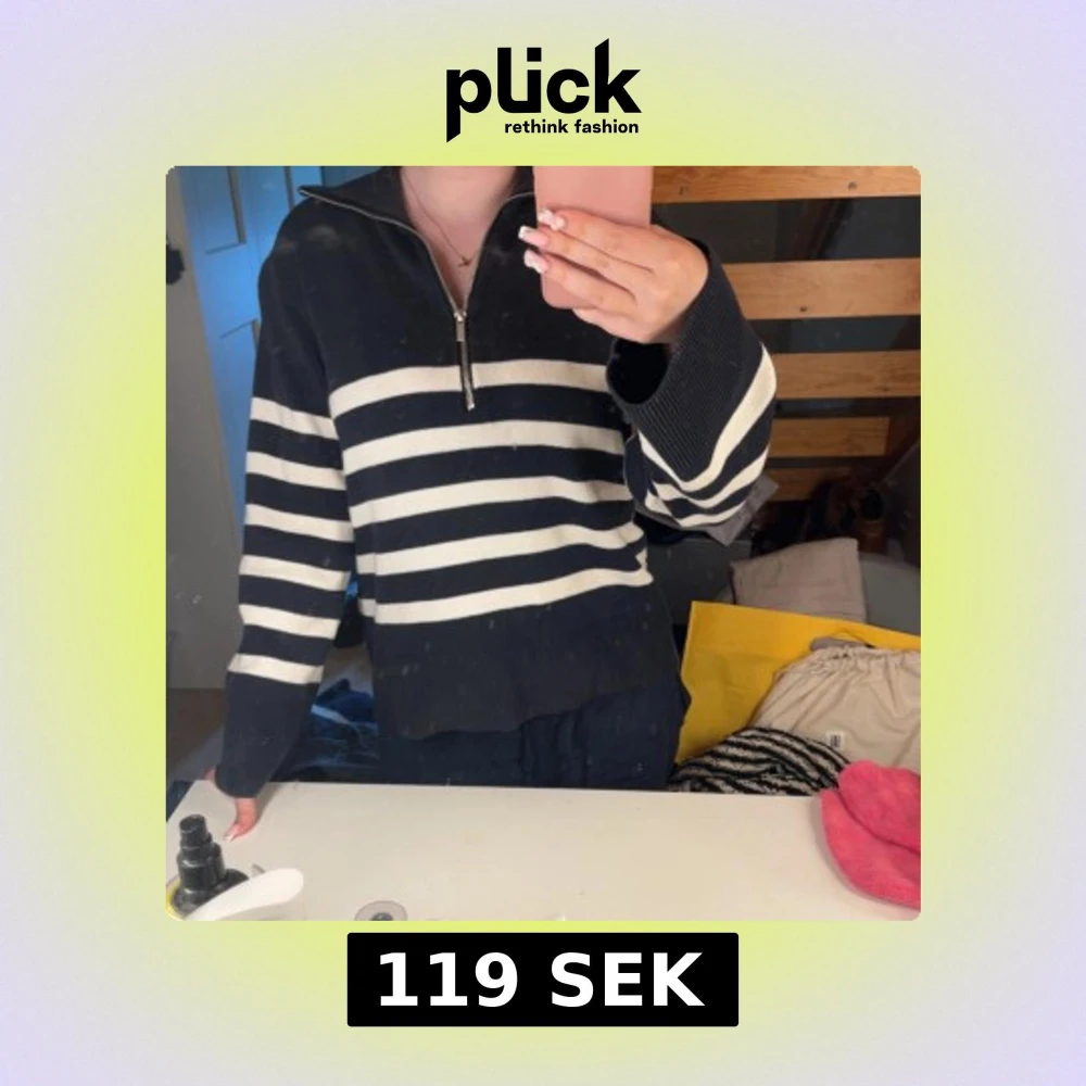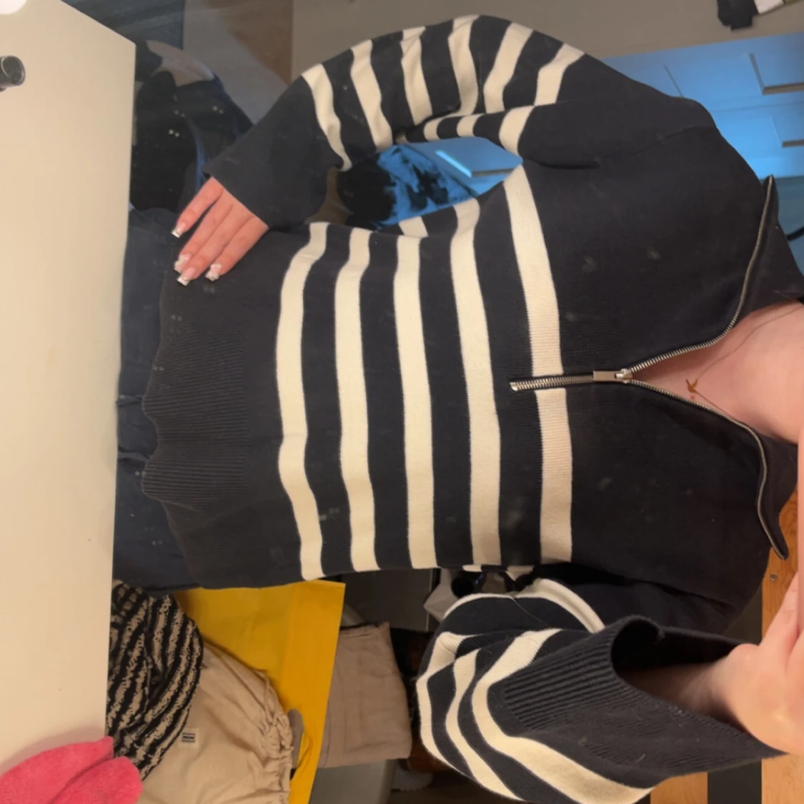 Säljer en svart och vit randig stickad tröja med half zip-dragkedja i halsen. Tröjan har långa ärmar och breda ribbade muddar. Perfekt för dig som gillar en chill och stilren look med lite marint vibe.