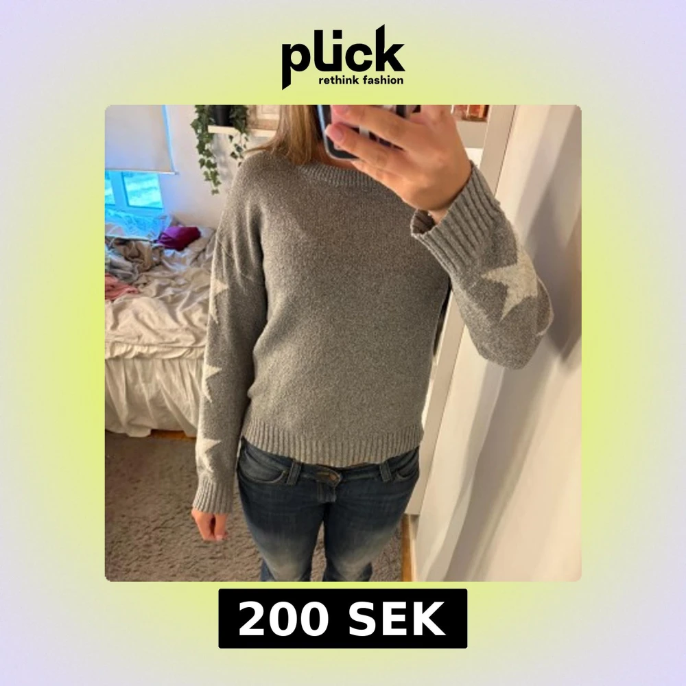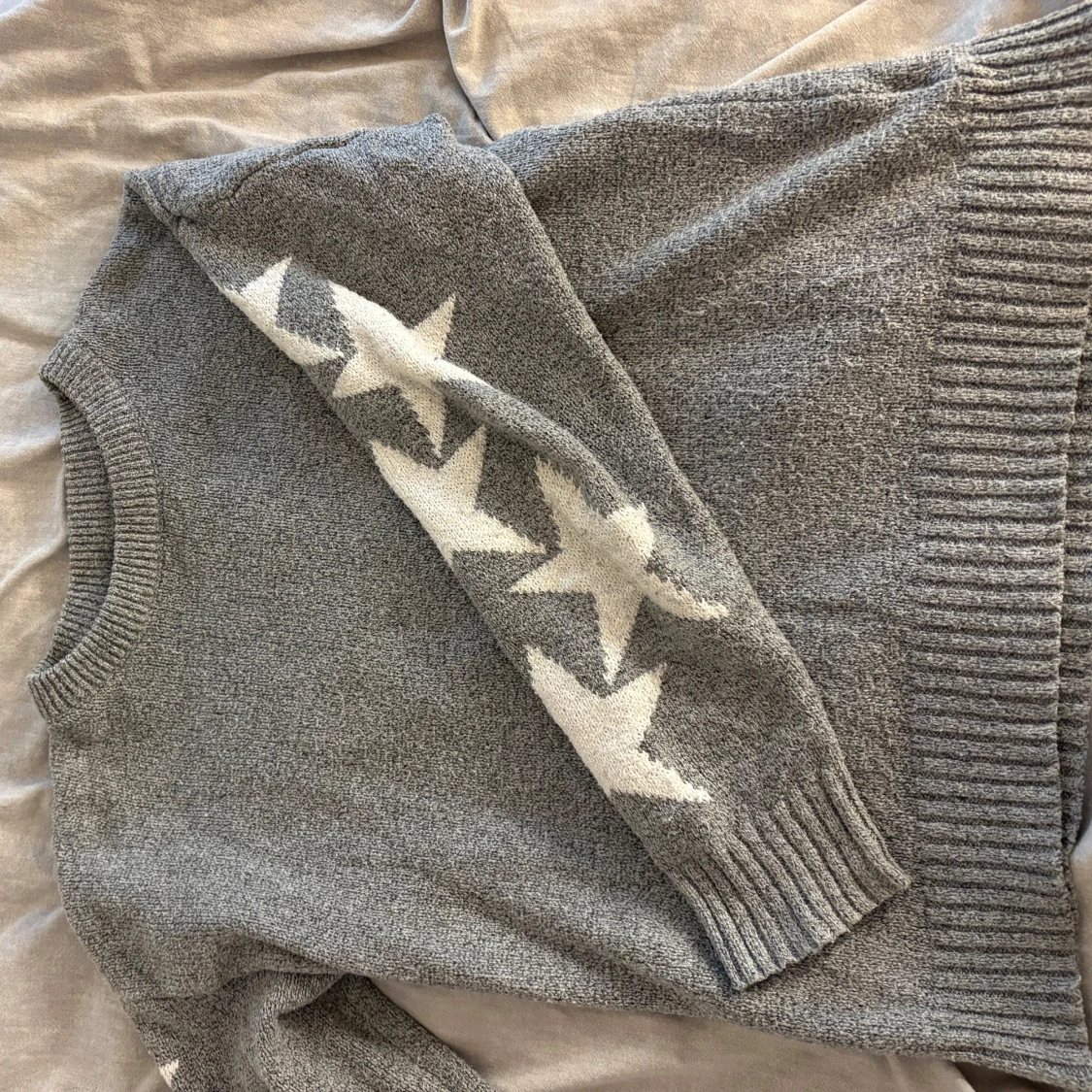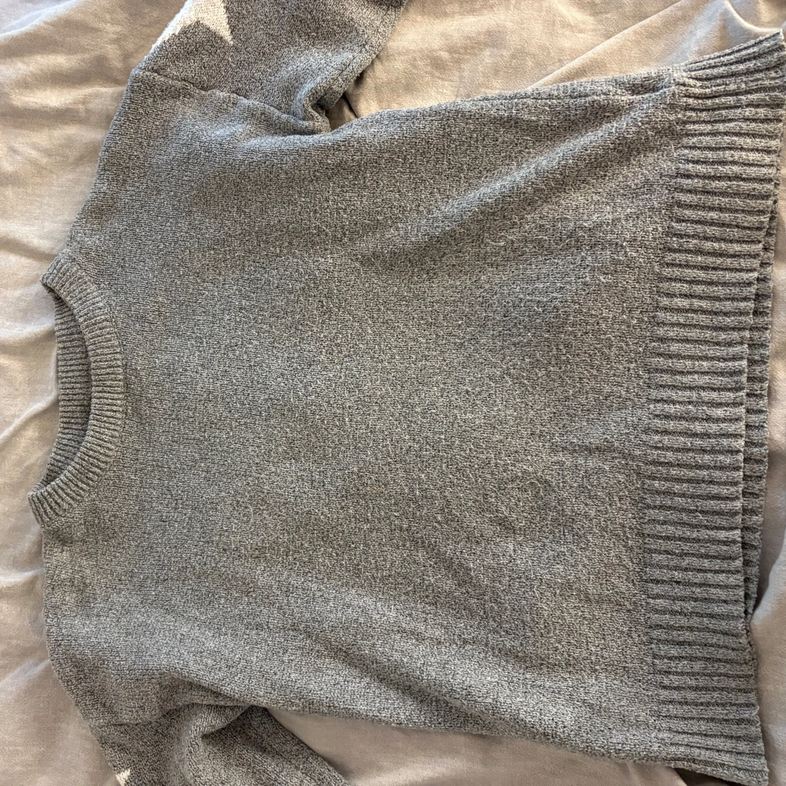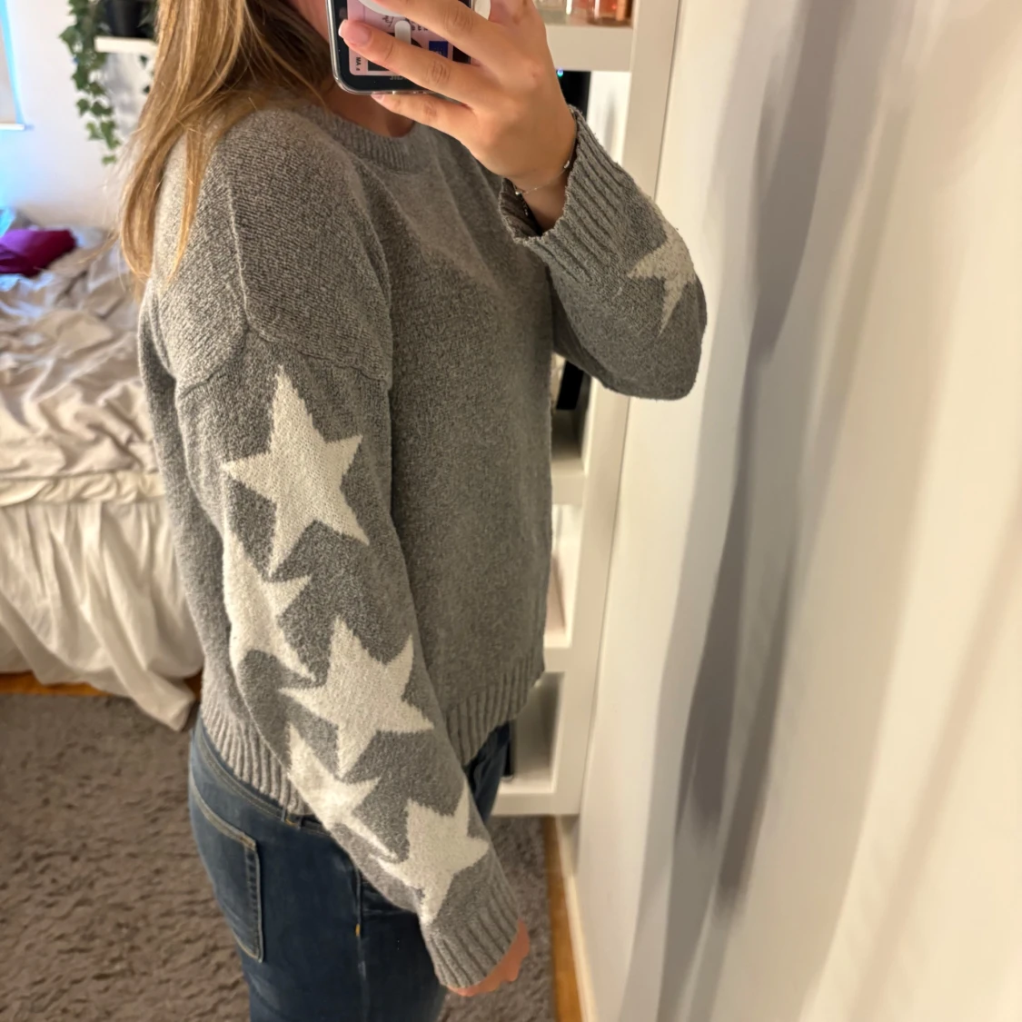 Mysig grå stickad tröja med vita stjärnor längs ärmarna. Tröjan har rund halsringning, ribbade muddar och en relaxed fit. Perfekt för dig som gillar en enkel men ändå cool look med lite extra detaljer på ärmarna.