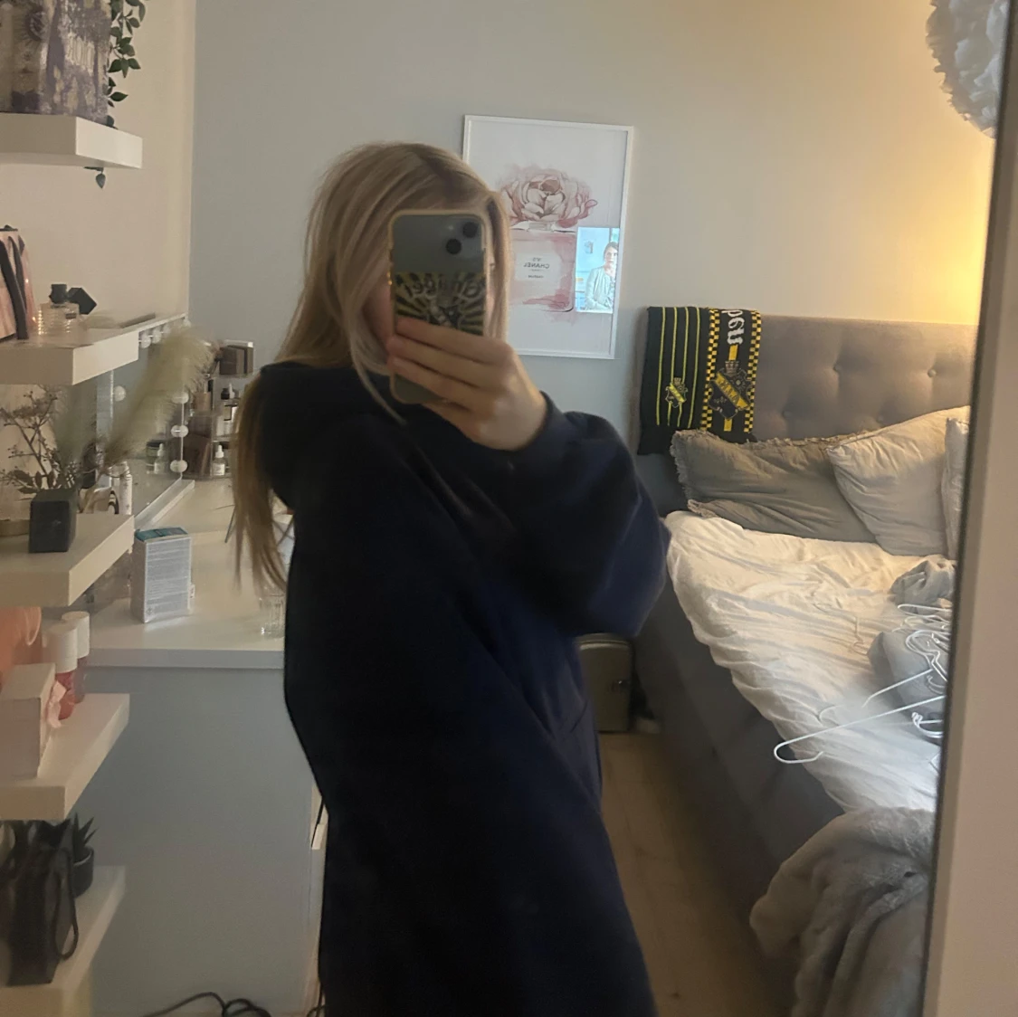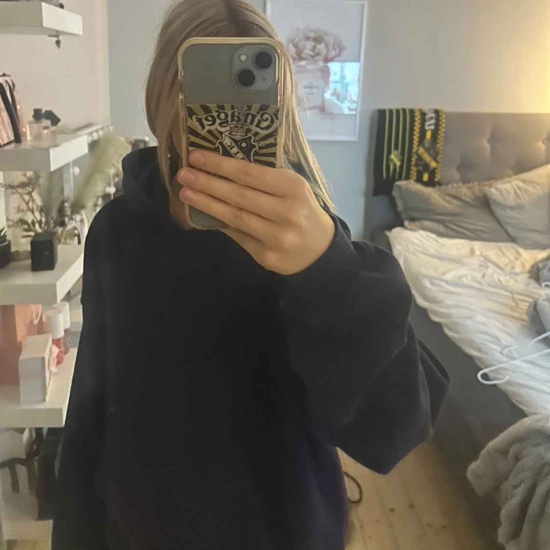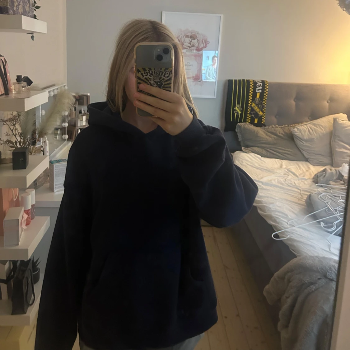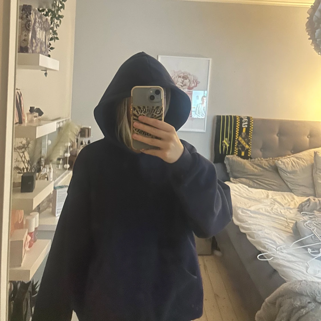 Säljer en mörkblå hoodie från gina med stor huva och långa ärmar. Perfekt för dig som gillar en chill och avslappnad stil. Hoodien har en klassisk look utan tryck eller detaljer och är riktigt mjuk och skön.