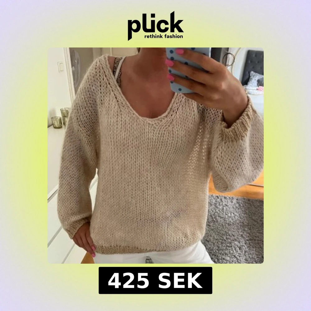 Säljer en beige stickad tröja med v-ringning och långa ärmar. Tröjan har en loose och oversized passform med ribbade muddar i guld. Perfekt för lager-på-lager och chill vibes. Står ingen storlek i
