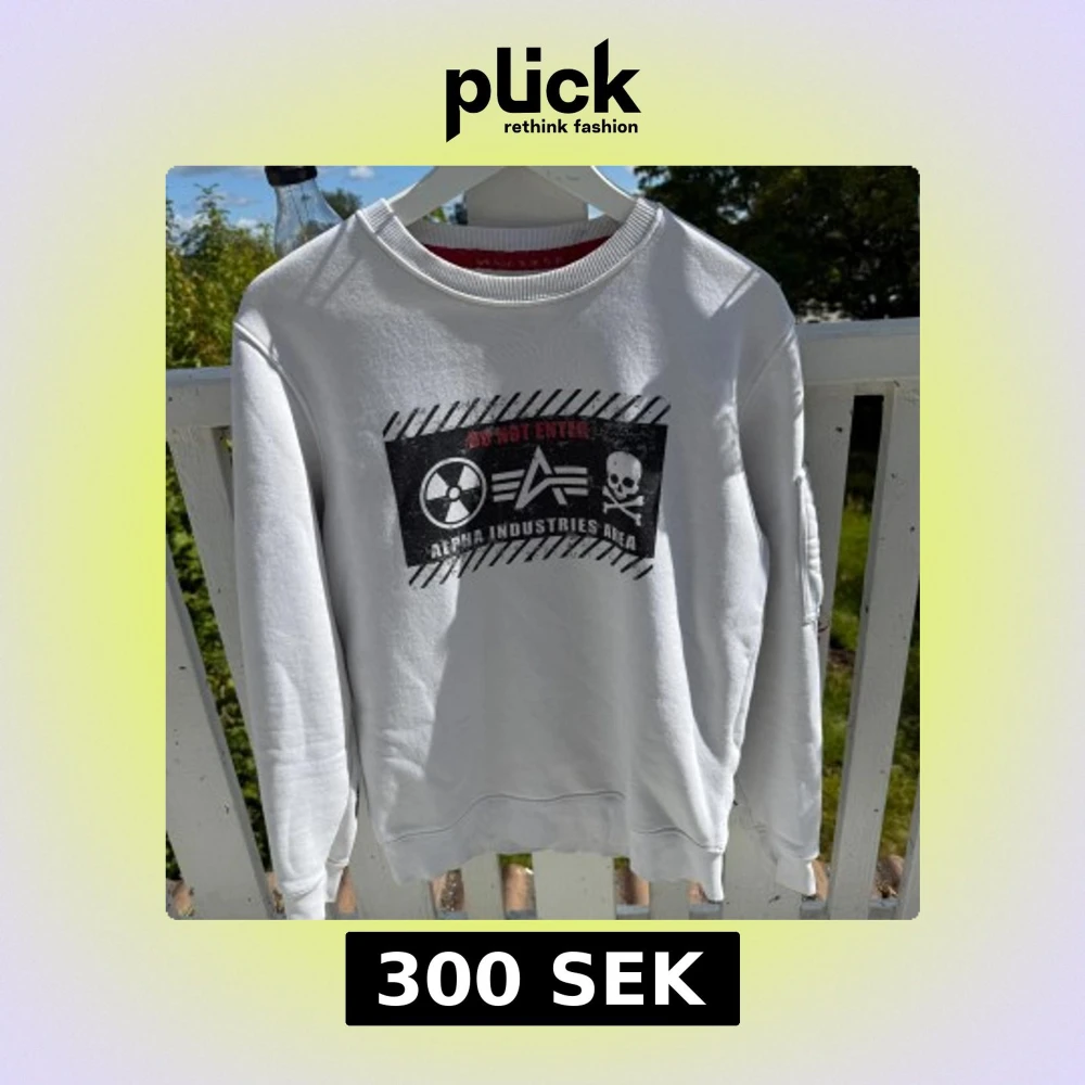 Säljer en vit sweatshirt från Alpha Industries med tryck på bröstet och ärmen. Framsidan har coolt grafiskt print med texten 'Do Not Enter' och logga, medan baksidan och ena ärmen har stora svarta bokstäver. Tröjan har rund hals och ribbade muddar.