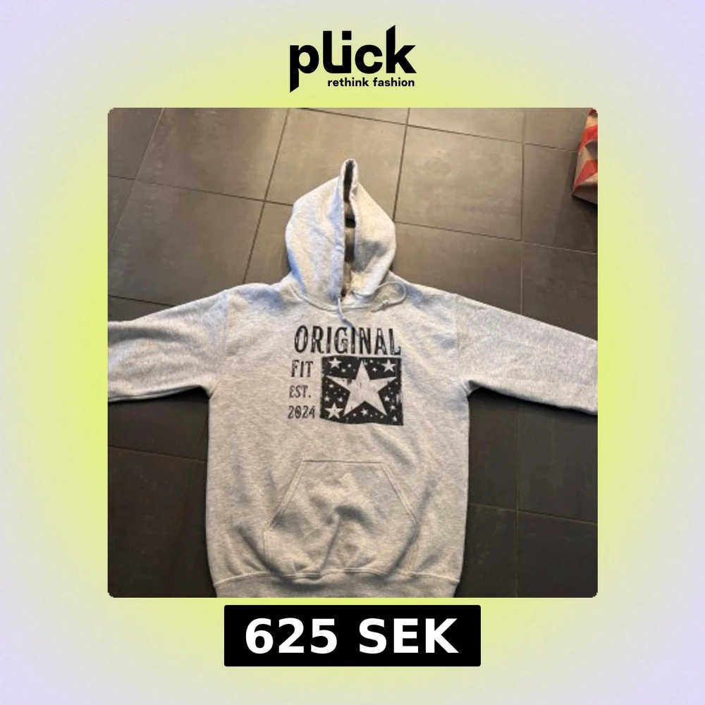 Säljer en ljusgrå hoodie med svart tryck framtill där det står 'Original Fit Est. 2024' och en stor stjärna med mindre stjärnor runt. Tröjan har huva med dragsko och en stor magficka. Perfekt för en avslappnad stil. Knappt använd!