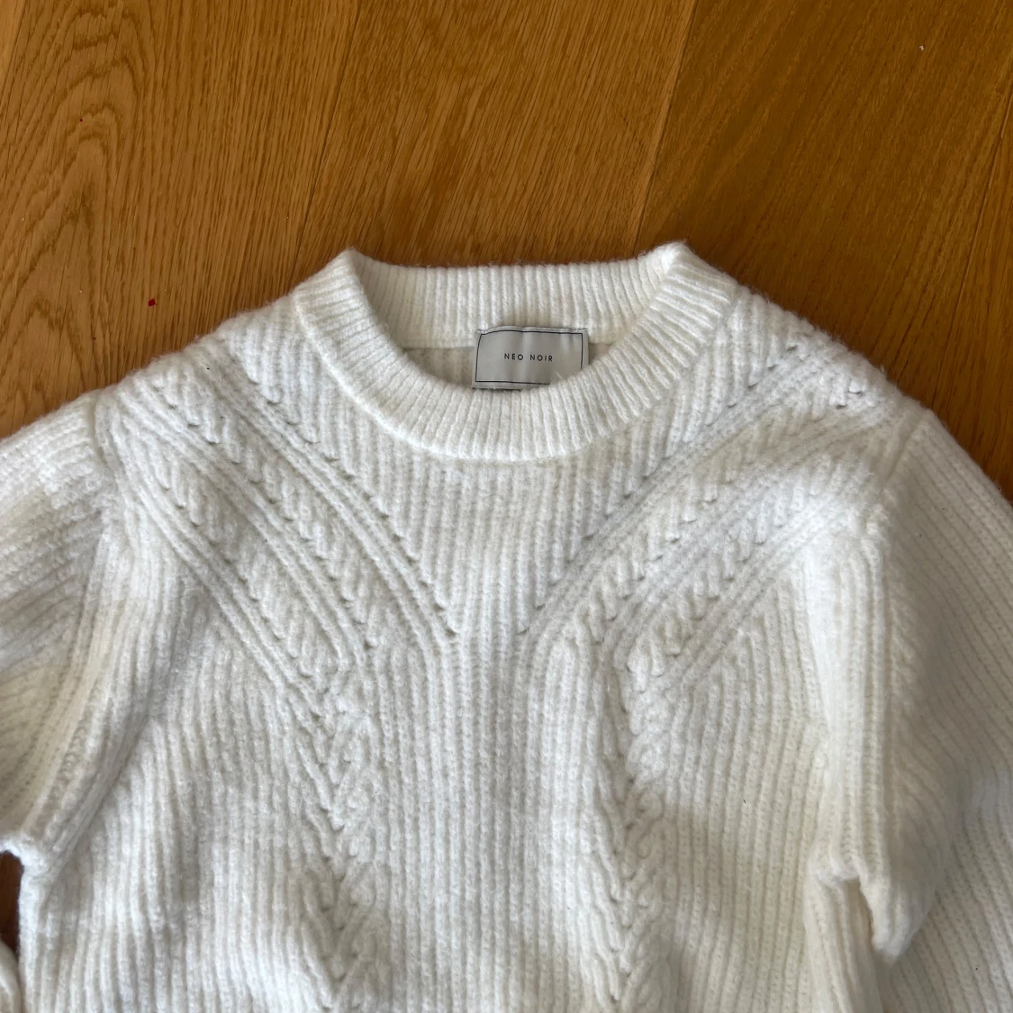 Helt ny Superfin vit stickad tröja från Neo Noir med snyggt kabelstickat mönster framtill. Tröjan har rund halsringning, ribbade muddar och långa ärmar. Perfekt för lager-på-lager och passar till allt från jeans till kjol.