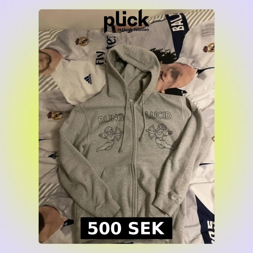 Säljer en grå hoodie från Blinglucid i storlek S. Tröjan har dragkedja, huva med snörning och två fickor fram. På bröstet finns coola strassdetaljer med texten BLINGLUCID och två änglar. Materialet är mjuk bomull och polyester.