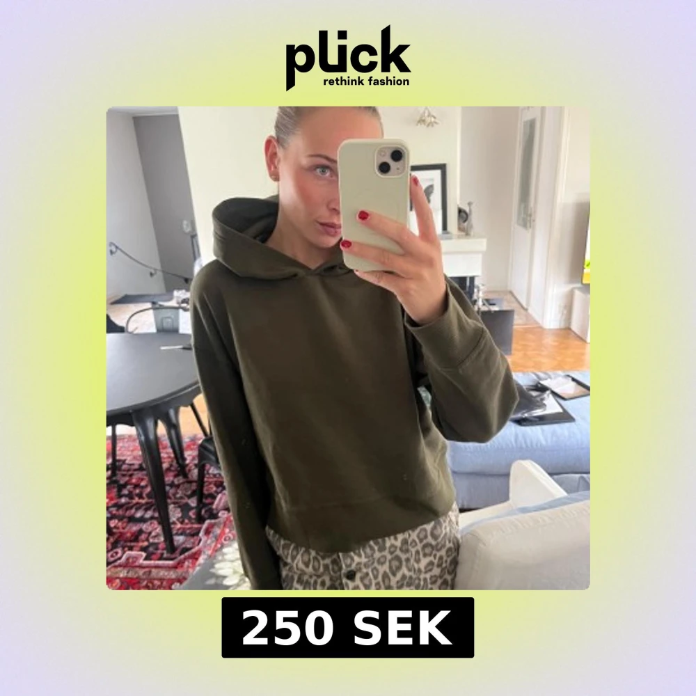 Säljer en olivgrön hoodie med huva och långa ärmar. Tröjan har en relaxed passform och är tillverkad i mjukt bomullsmaterial. Perfekt för chill dagar eller när du vill ha en enkel och stilren look.