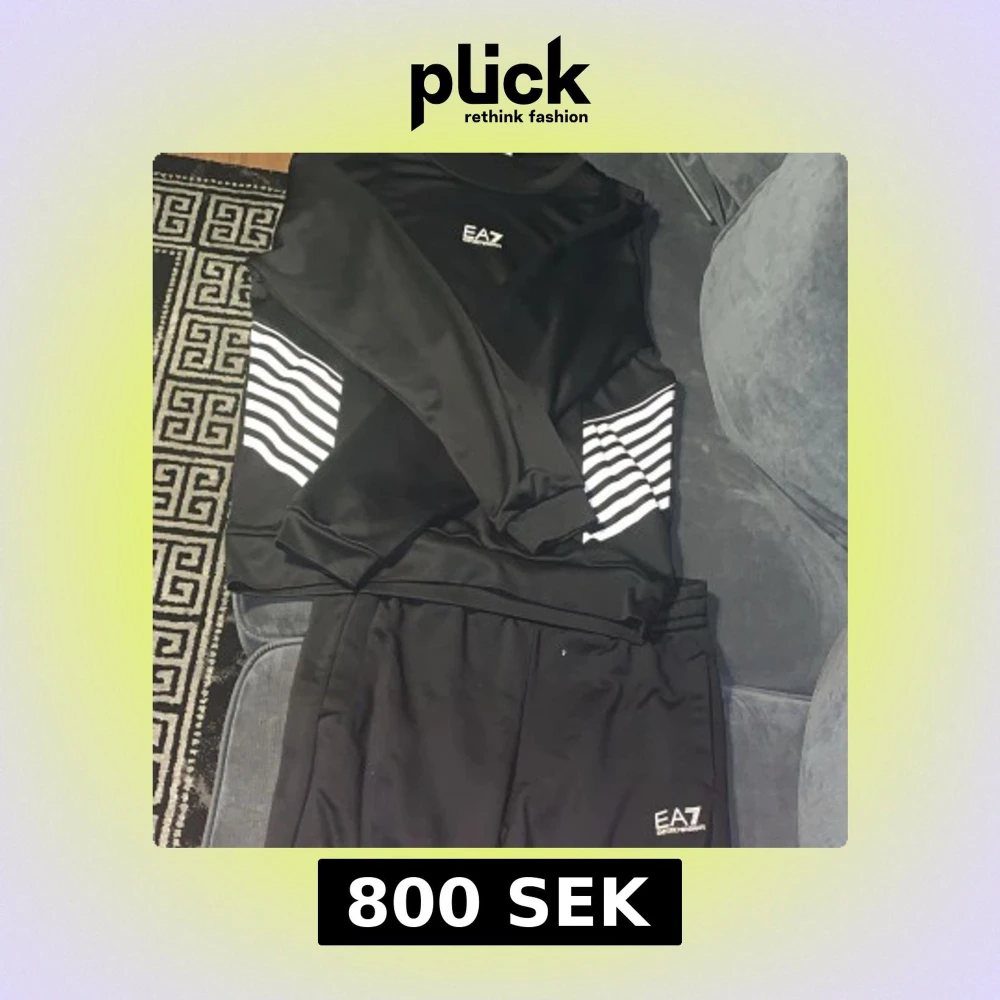 Svart långärmad tröja från EA7 Emporio Armani med vita horisontella ränder på sidorna och logga på bröstet. Tröjan har en sportig vibe och är gjord i ett glansigt, mjukt material som känns skönt mot huden.
