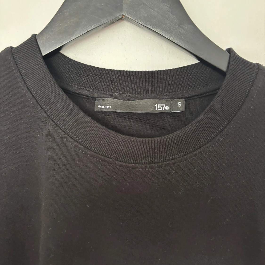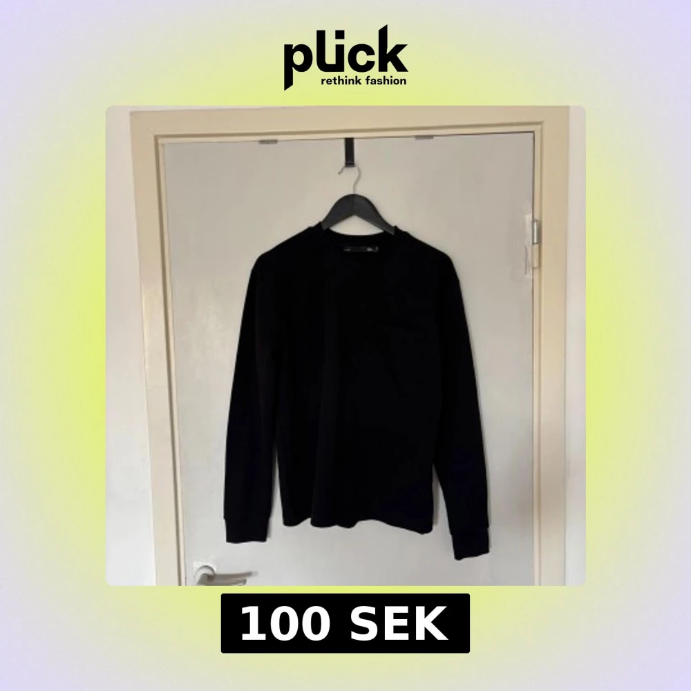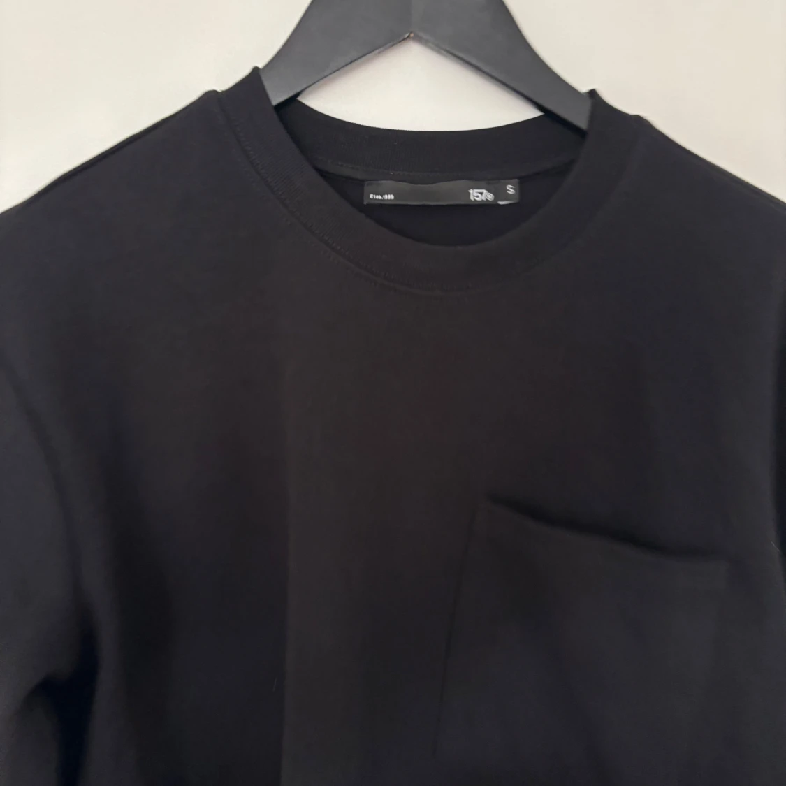 Enkel svart långärmad tröja från 157 i storlek S. Tröjan har rund halsringning och en bröstficka som ger en clean och stilren look. Perfekt till jeans eller cargo pants. Materialet är mjukt och känns skönt mot huden.