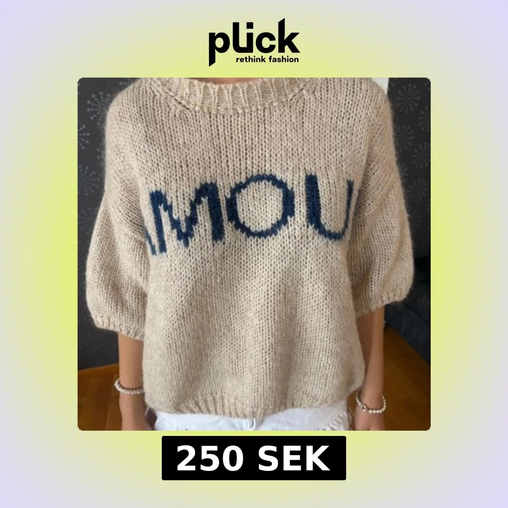 Så snygg beige stickad tröja med texten ”Amour” i blått😍😍