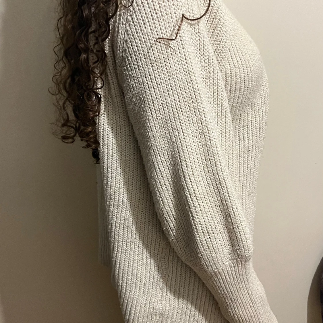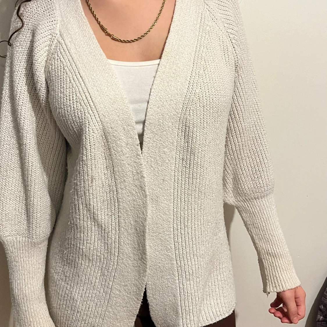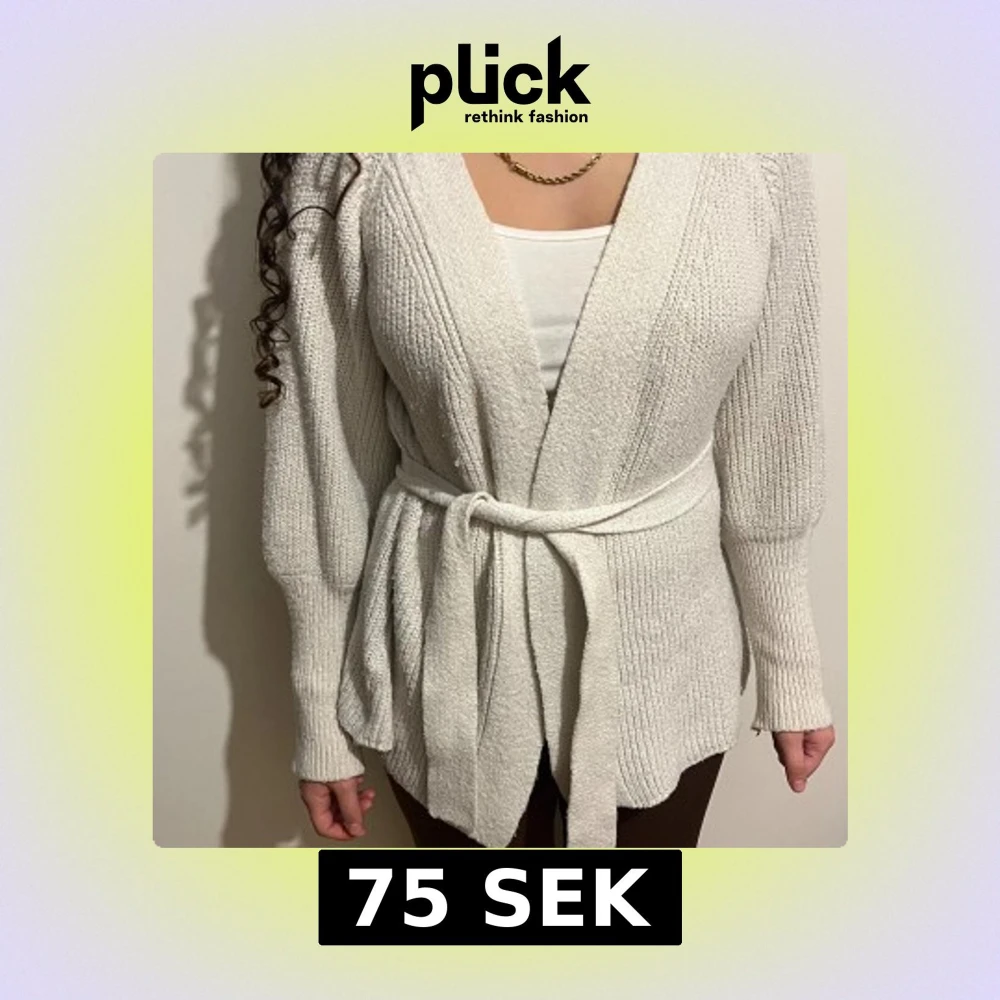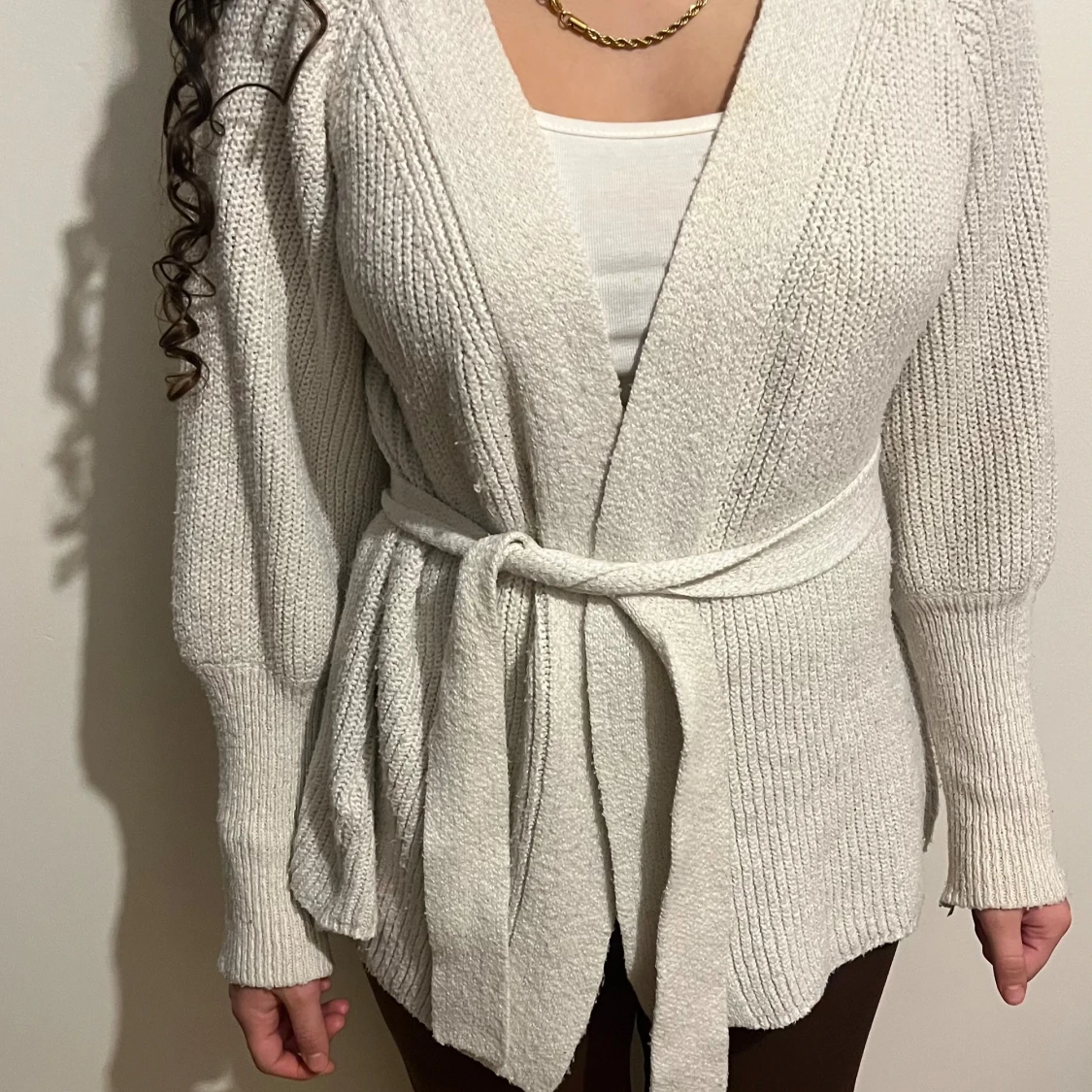 Mysig vit stickad kofta med lång ärm och bred ribbad struktur. Koftan har ett matchande bälte i midjan som kan knytas för extra stilpoäng. Perfekt att slänga på sig när det är lite kyligt ute. Snygg v-ringad öppning framtill och skön passform.