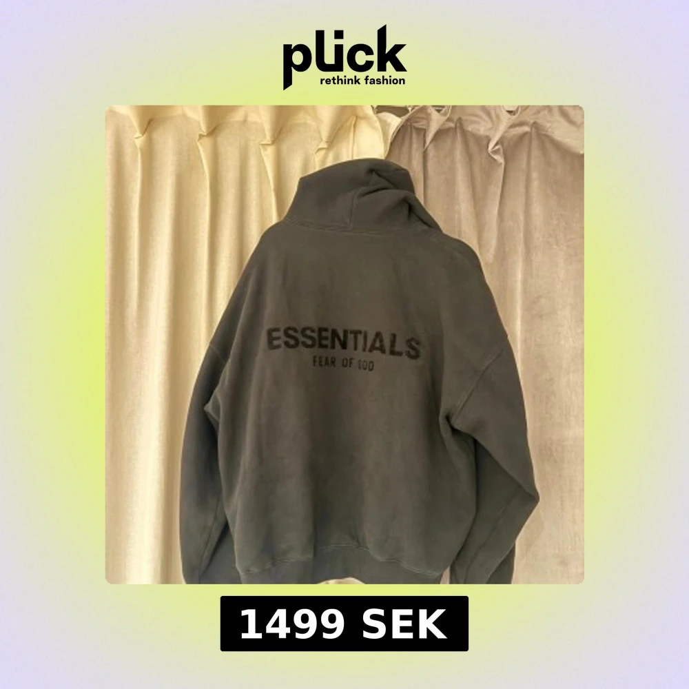 Svart hoodie från Essentials Fear of God med stor logga på ryggen. Oversized passform och huva. Tillverkad i mjuk bomull och polyesterblandning, perfekt för chill dagar. Klassisk look med nedhasade axlar och breda ärmar.