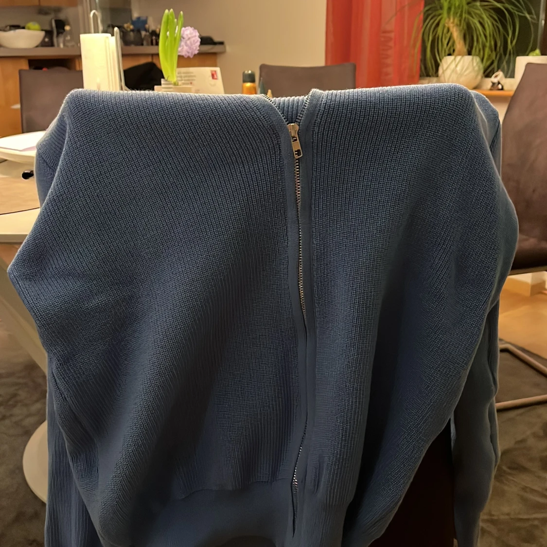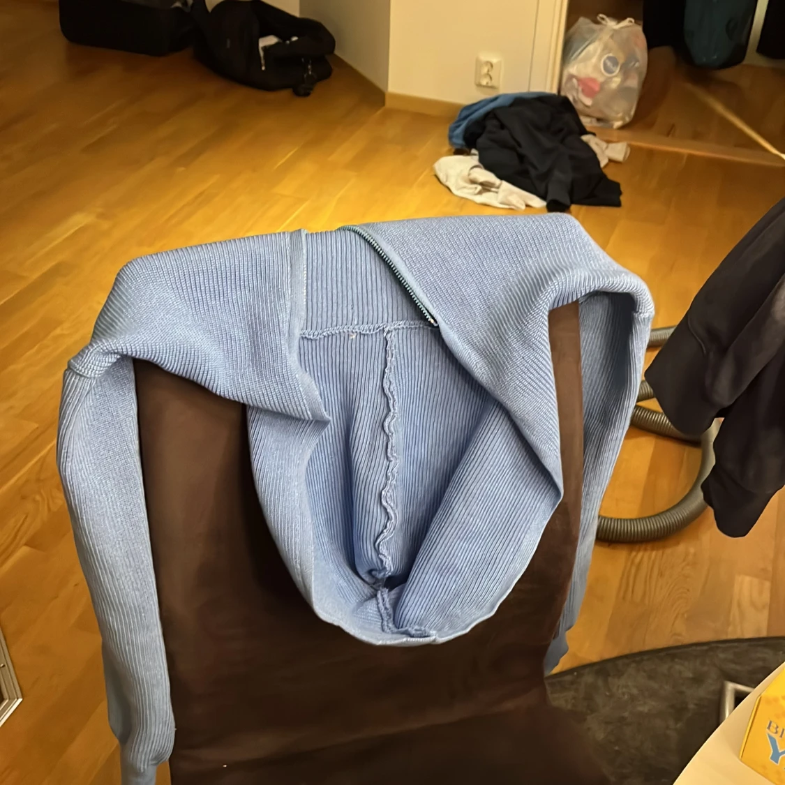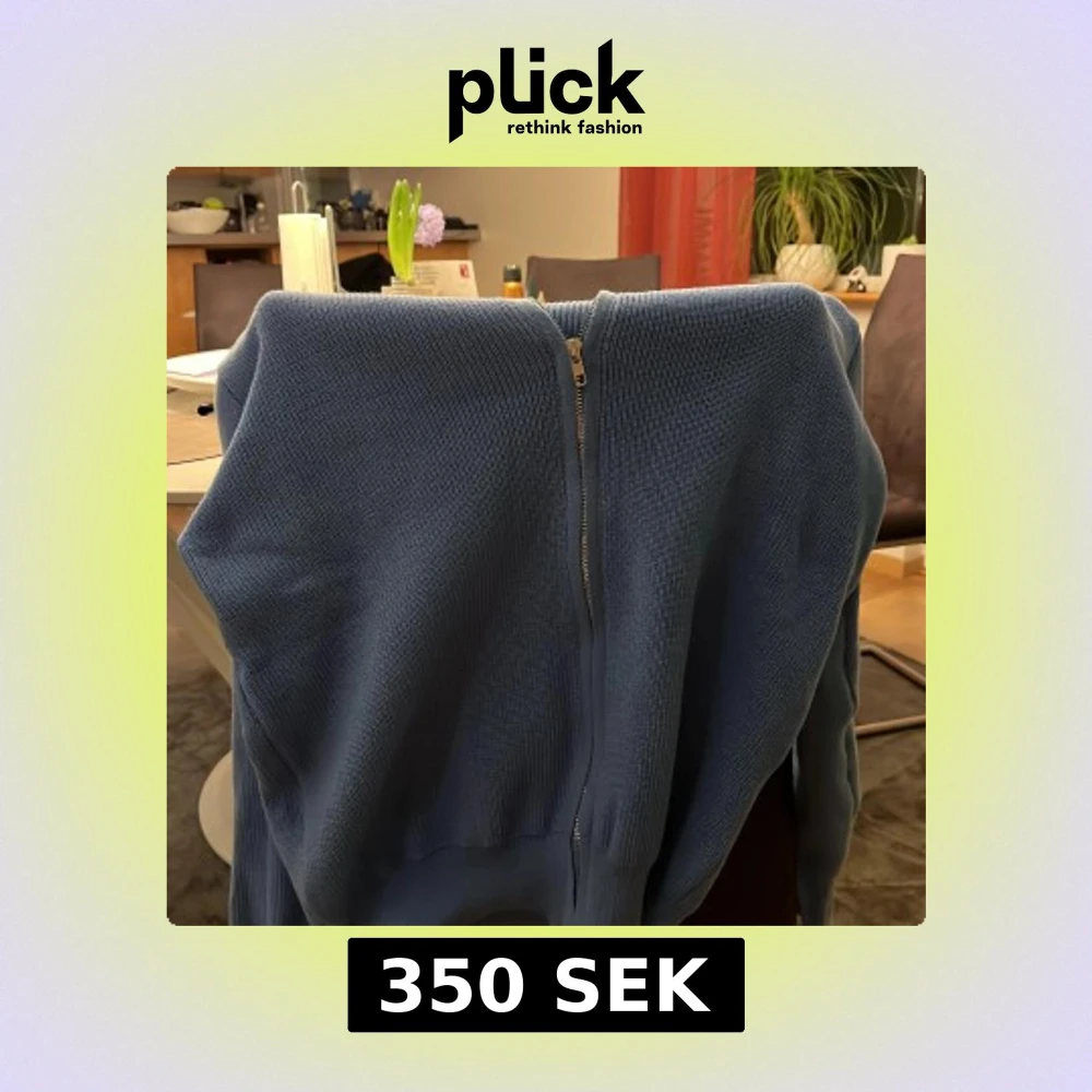 Säljer en snygg blå stickad tröja med dragkedja. Perfekt för kyliga dagar och ger en stilren look. Tröjan har en enkel design som passar till det mesta. 10/10 i skick inte använd pga för liten