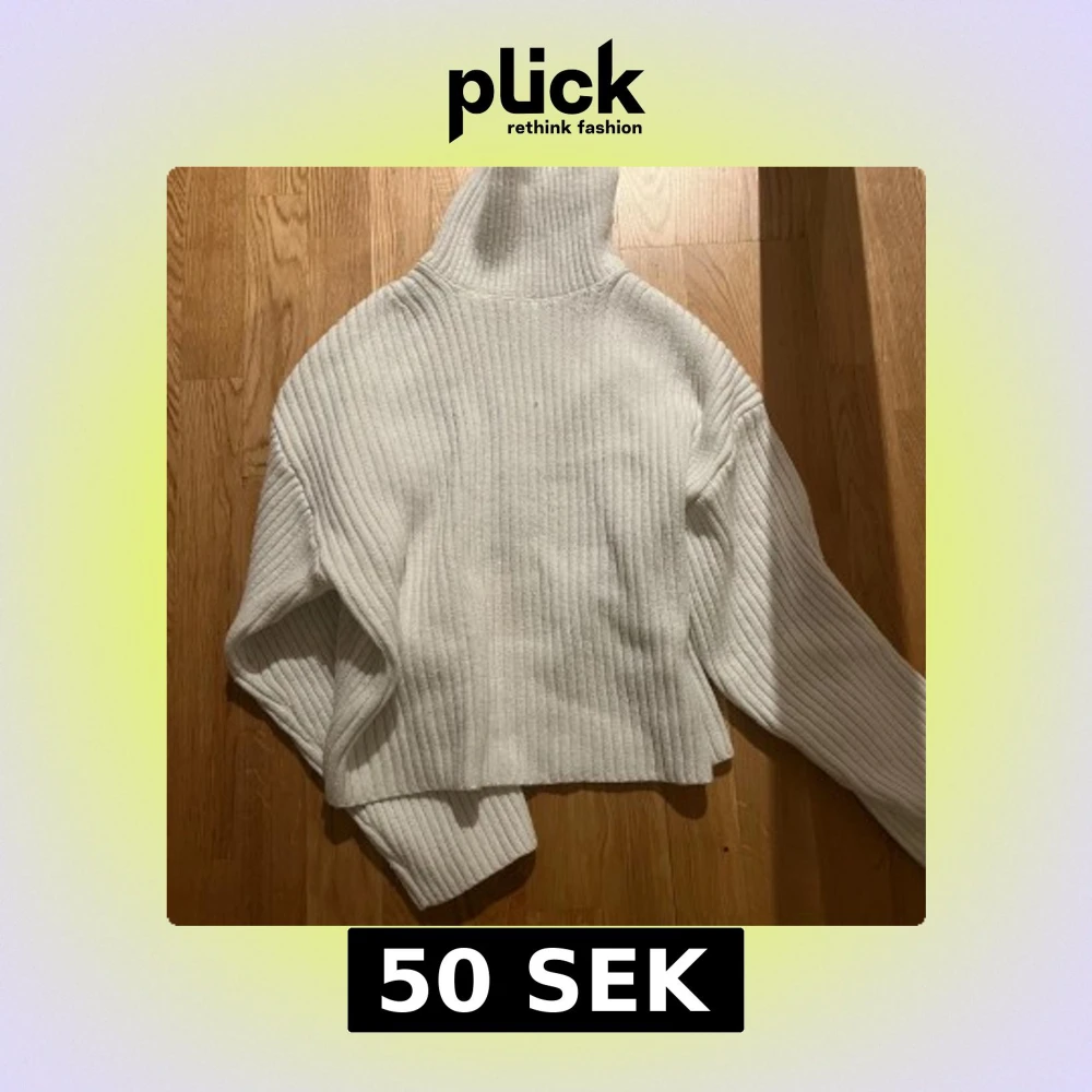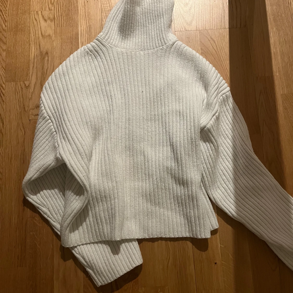 Säljer en stilren vit ribbad polotröja med långa ärmar. Perfekt för kyligare dagar med sin mysiga och varma design. Tröjan har en hög krage som ger extra värme och stil.