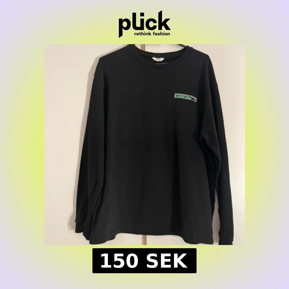 Svart långärmad tröja från Envii med trycket 'ESSENTIAL' i grönt och vitt på bröstet. Baksidan har ett stort fototryck i blå och gröna toner. Tröjan har en klassisk passform och är gjord i mjuk bomull. Perfekt för dig som gillar streetstyle och snygga prints.