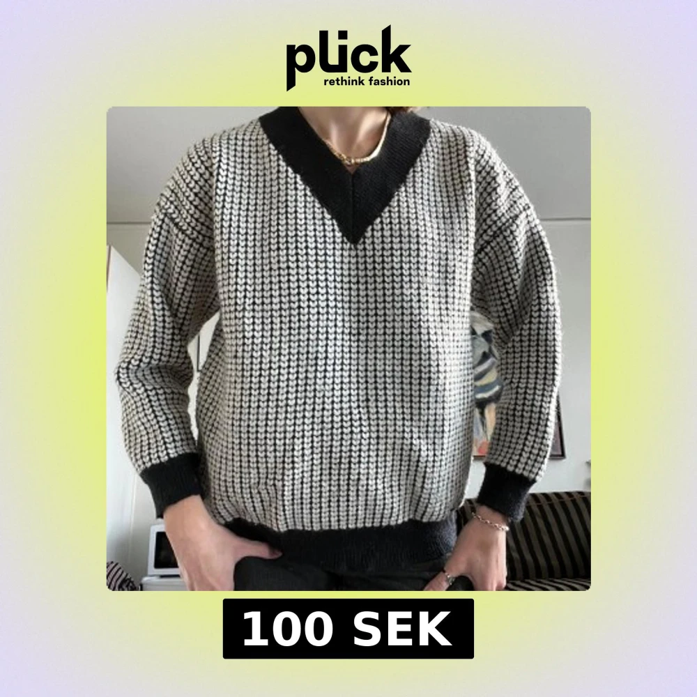 Säljer en stickad tröja i svart och vitt med bred v-ringning och svarta muddar. Tröjan har ett grovt stickat mönster och är långärmad med avslappnad passform. Perfekt för lager-på-lager och chill dagar.
