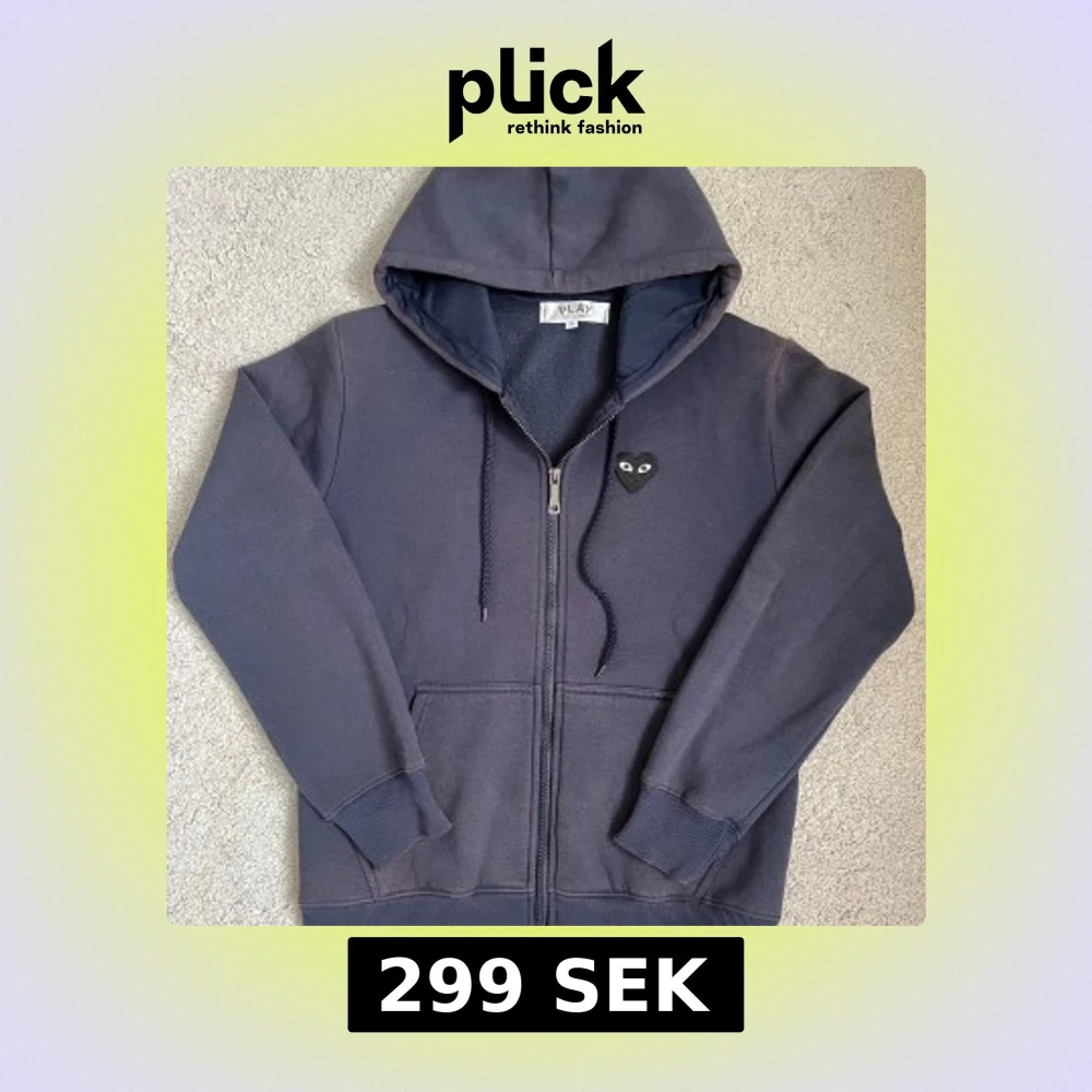 Mörkblå hoodie från Comme des Garçons Play i storlek S. Tröjan har huva med snörning, dragkedja och fickor fram. Ikoniskt hjärta med ögon broderat på bröstet och stort tryck på ryggen. Tillverkad i mjuk bomull, perfekt för chill dagar. Tröjan har förlorat lite av sin färg men det är inget man tänker på därav priset.
