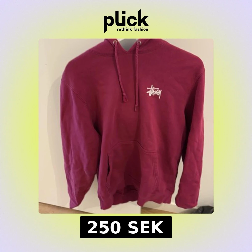 Säljer en vinröd hoodie från Stüssy med stor vit logga på ryggen och mindre logga på bröstet. Tröjan har huva med snörning och en klassisk känguruficka framtill.