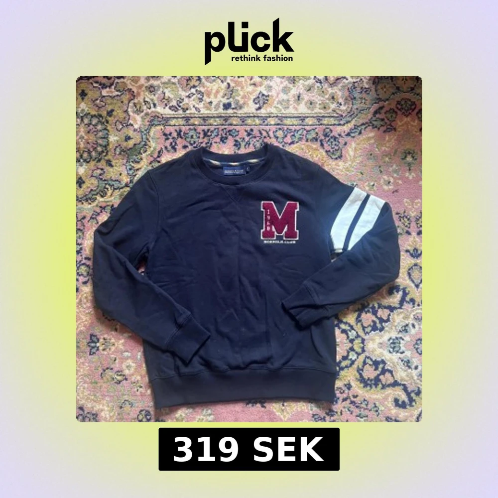 Mörkblå sweatshirt från Morris R. Club med stor röd M-applikation och broderad text på bröstet. Vit och blå randig detalj på ena ärmen. Klassisk rund hals och ribbade muddar. Tillverkad i mjuk bomull, perfekt för chill dagar.