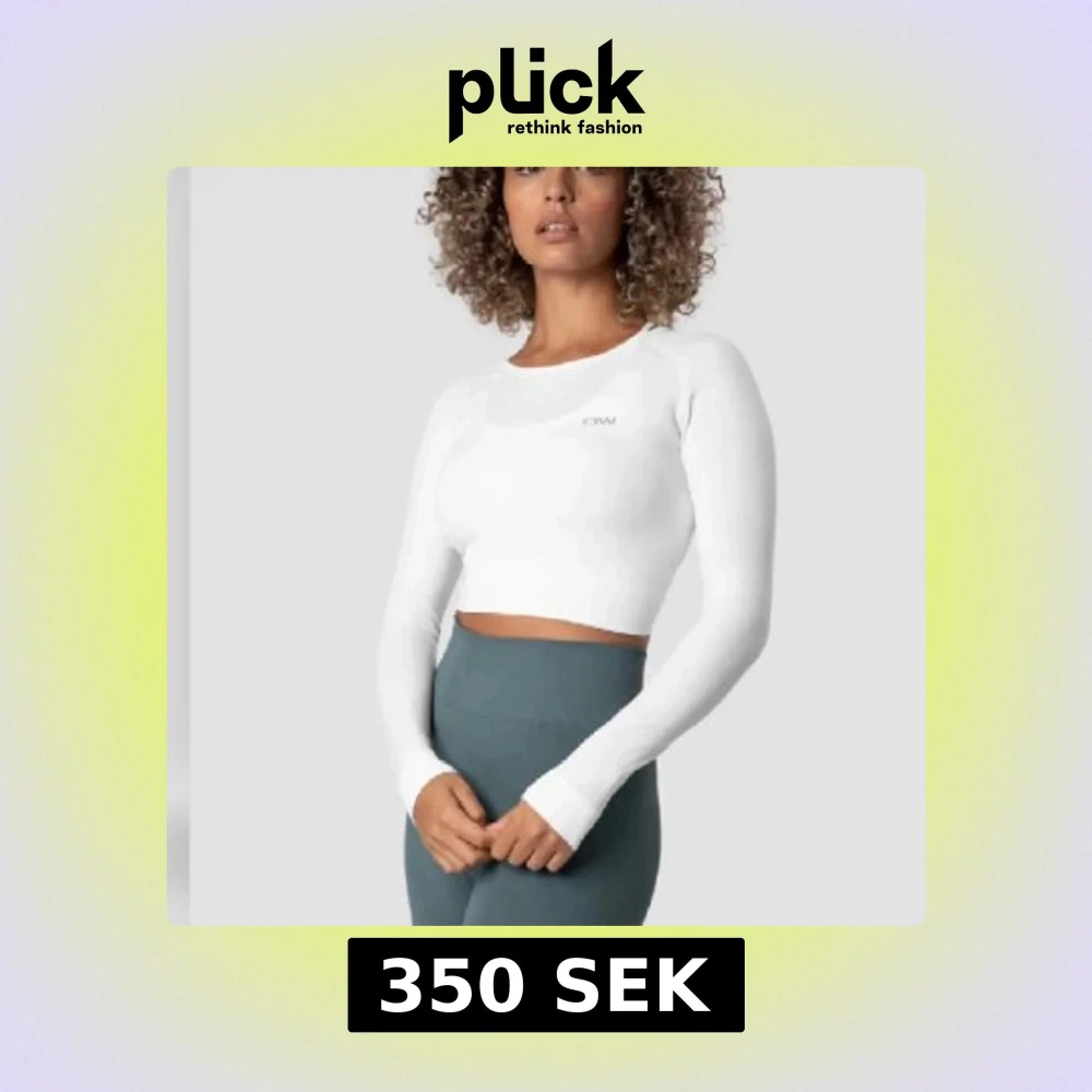 Säljer en vit croppad långärmad topp från ICANIWILL. Tight passform med rund halsringning och diskret logga på bröstet. Perfekt för träning eller när du vill ha en sportig look. Materialet är stretchigt och bekvämt, troligen polyesterblandning.