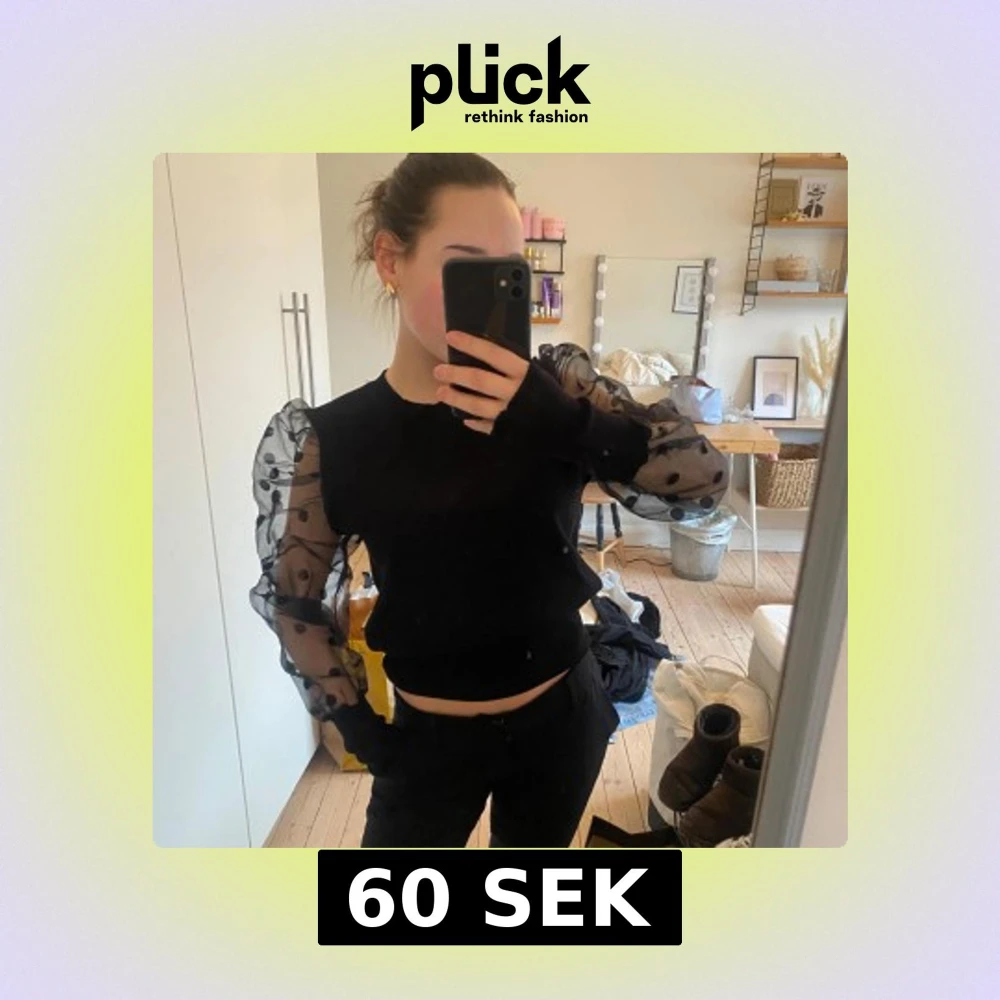 Snygg svart tröja med transparenta ärmar i mesh och prickigt mönster. Stolek S/XS. 60kr🖤