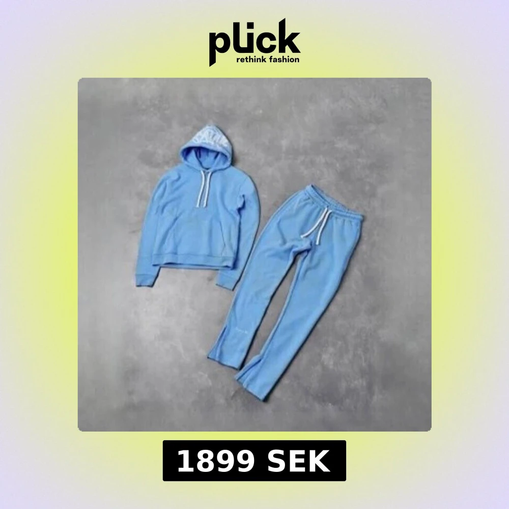 Snyggt och bekvämt set med en blå hoodie och matchande byxor. Hoodien har en justerbar dragsko i huvan och en stor ficka framtill. Byxorna har en elastisk midja med dragsko för perfekt passform. Perfekt för en avslappnad stil. Byxorna har en liten fläck som jag kan visa om ni kontaktar.