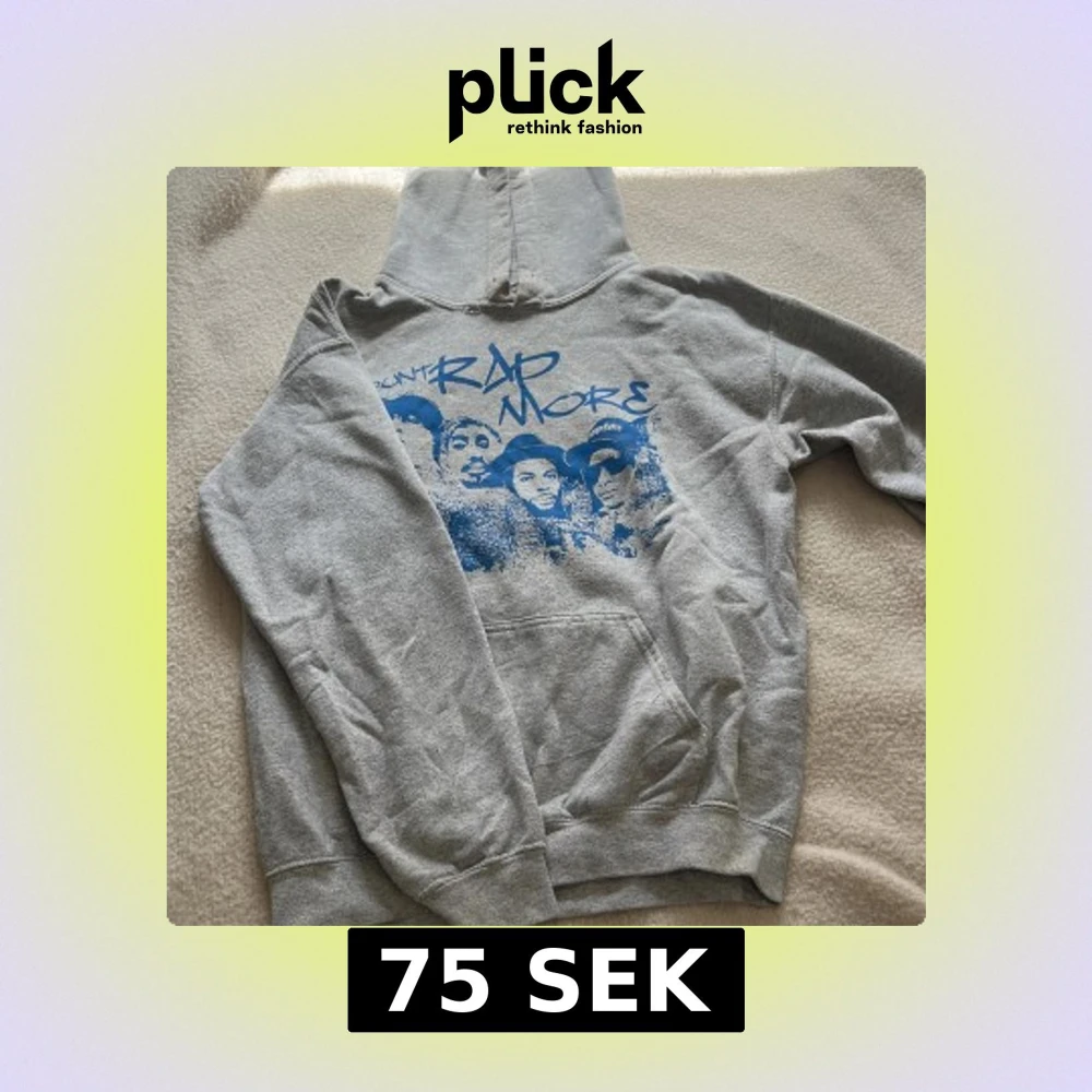 Säljer en grå hoodie med blått tryck på bröstet där det står 'Mount Rap More' och har motiv av fyra personer. Tröjan har huva och magficka. Defekt syns på bild 3 snöre går att sätta in men inget som finns i nu läget